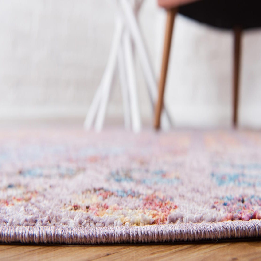 Primary color is Lilac. Colors in this rug include: Lilac, Blue, Gold, Navy Blue, Orange, Purple.