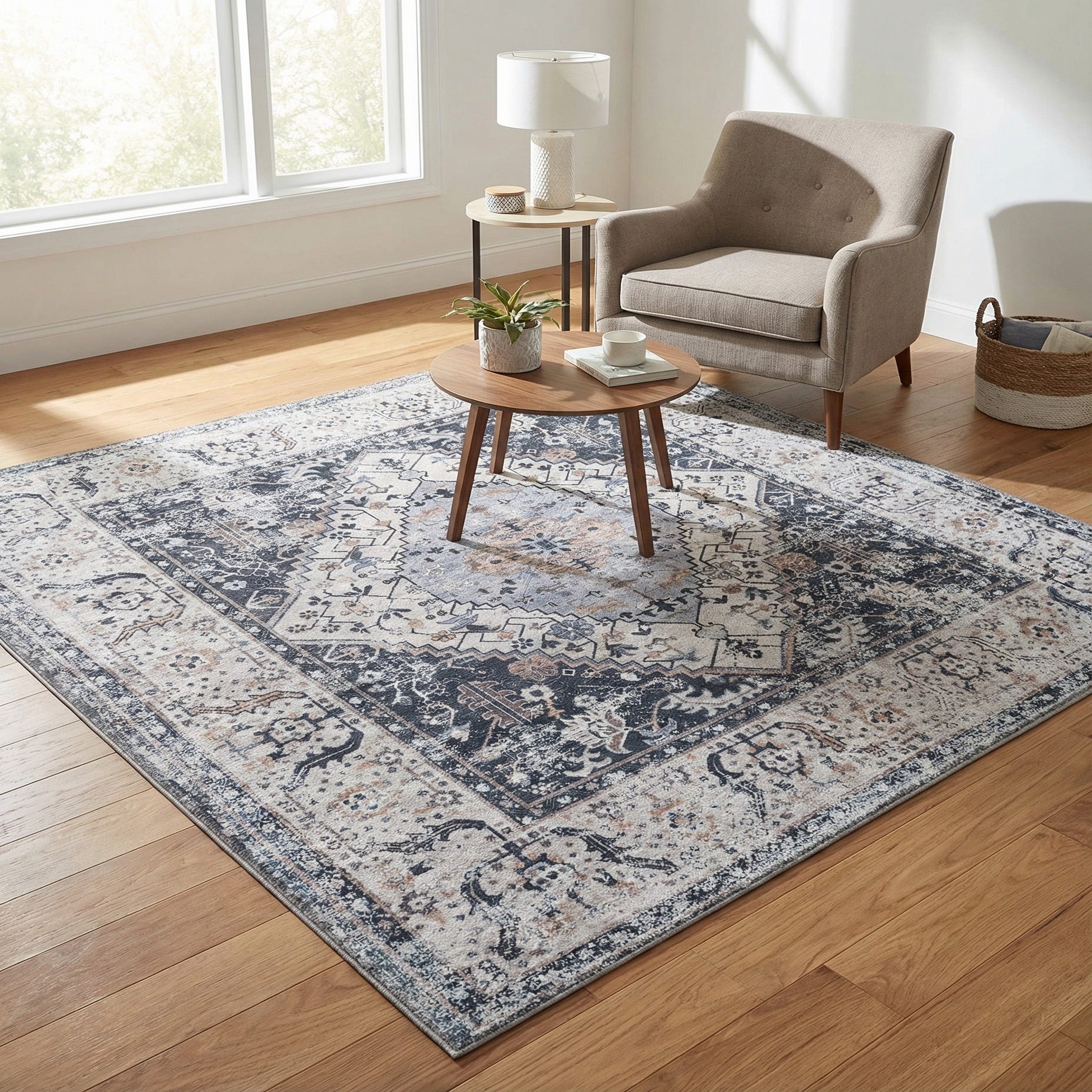 Primary color is Linen Charcoal. Colors in this rug include: Linen Charcoal, Beige, Gray, Ivory, Light Blue, Light Brown.