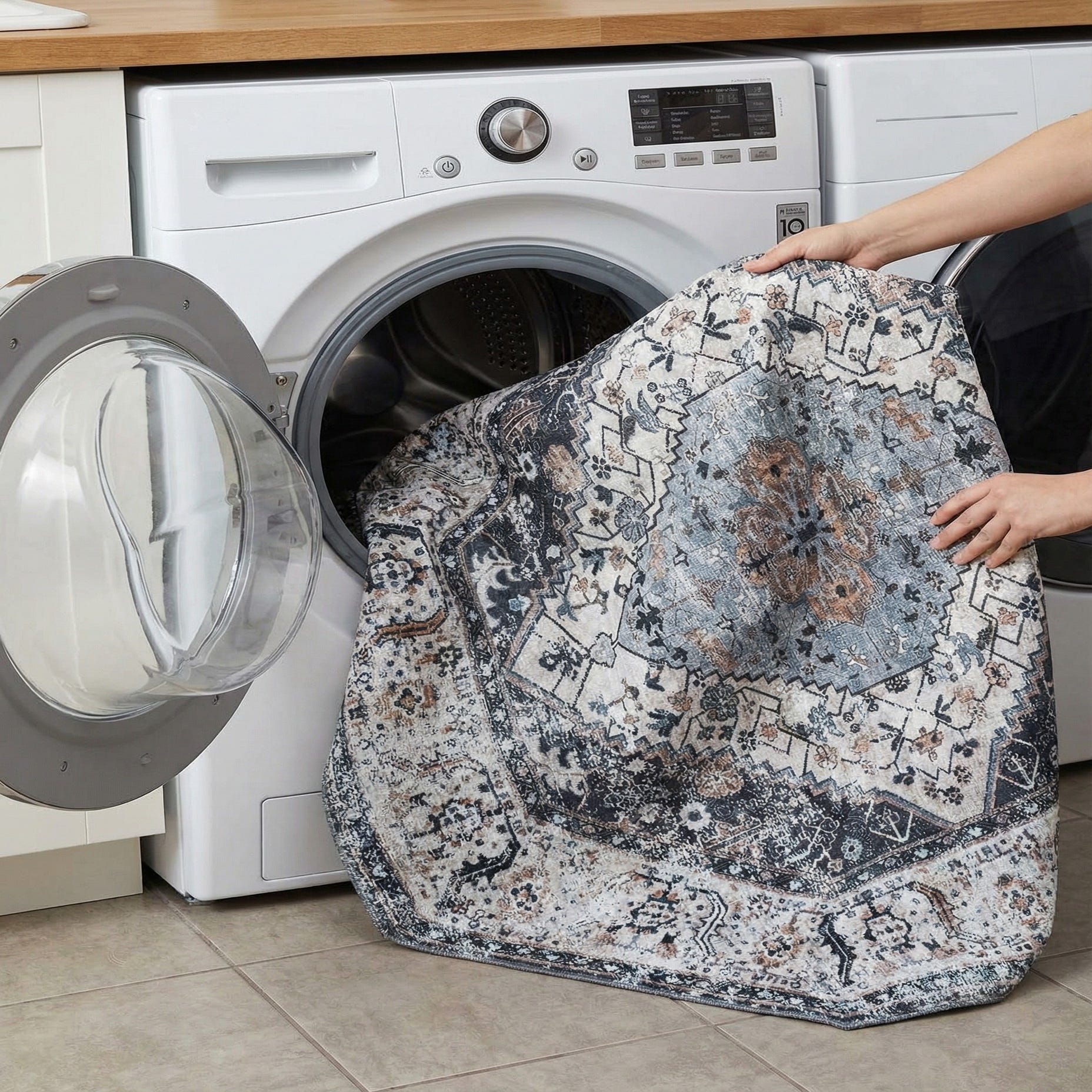 Primary color is Linen Charcoal. Colors in this rug include: Linen Charcoal, Beige, Ivory, Gray, Light Blue, Light Brown.