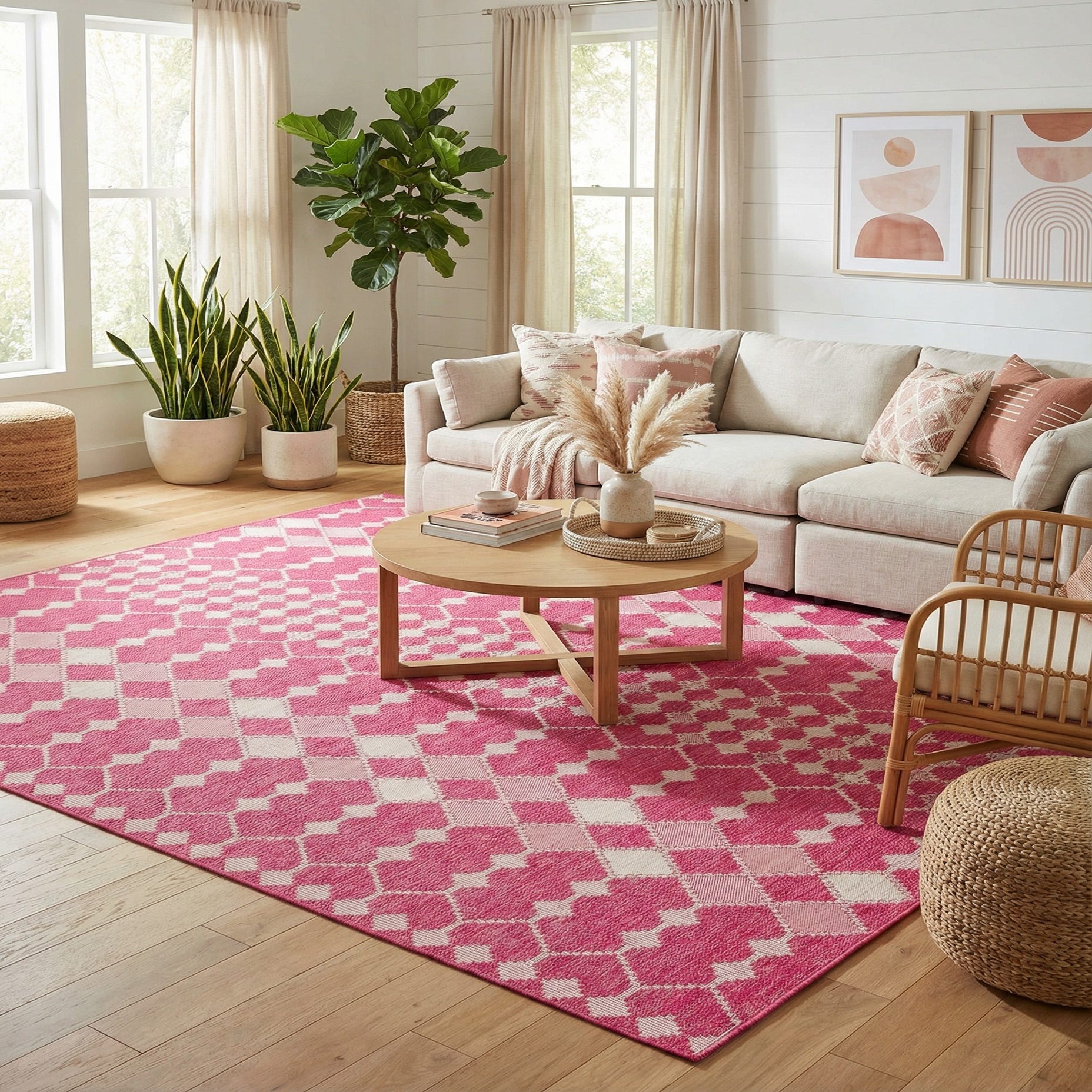 Primary color is Magenta. Colors in this rug include: Magenta, Ivory, Pink.