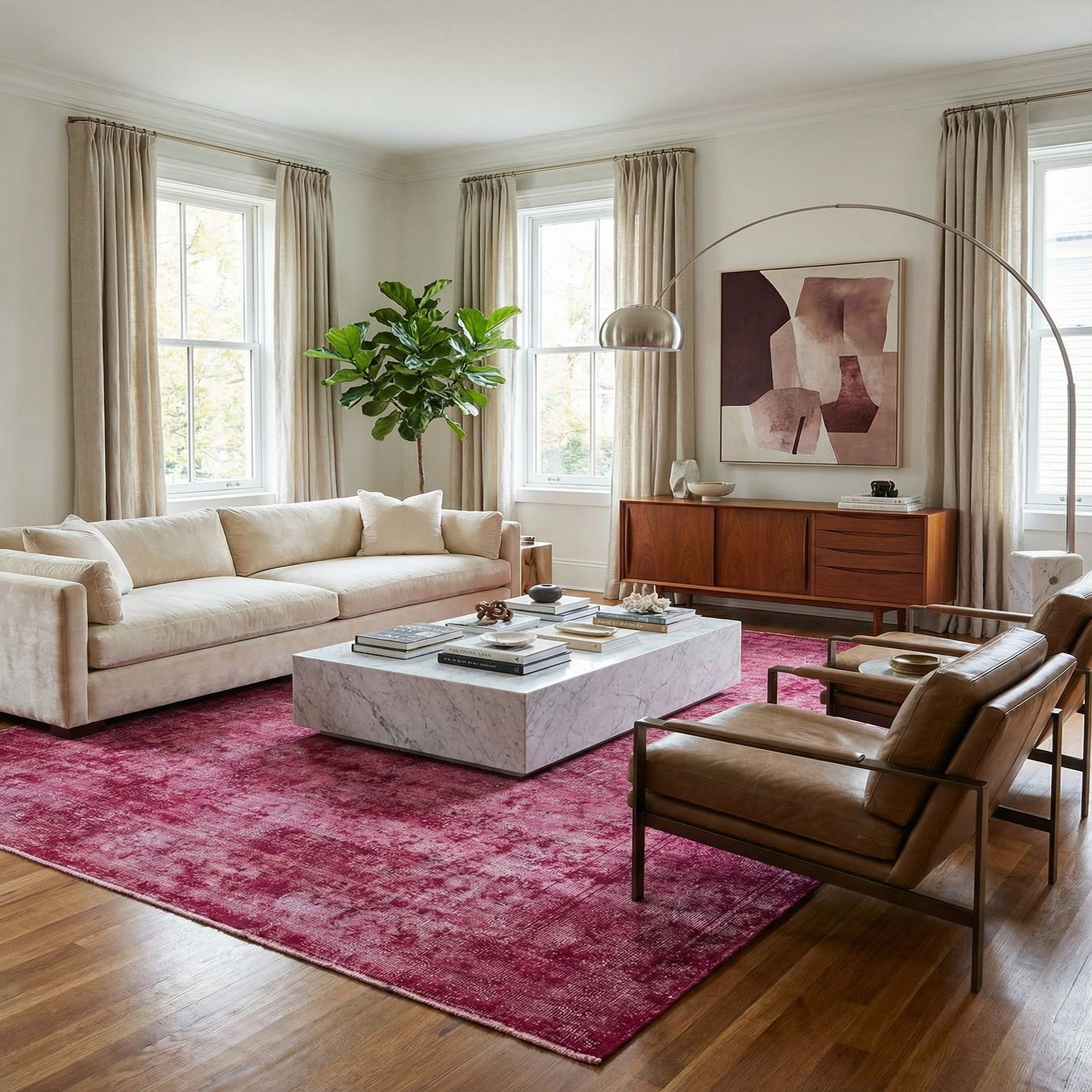 Primary color is Magenta. Colors in this rug include: Magenta, Ivory.