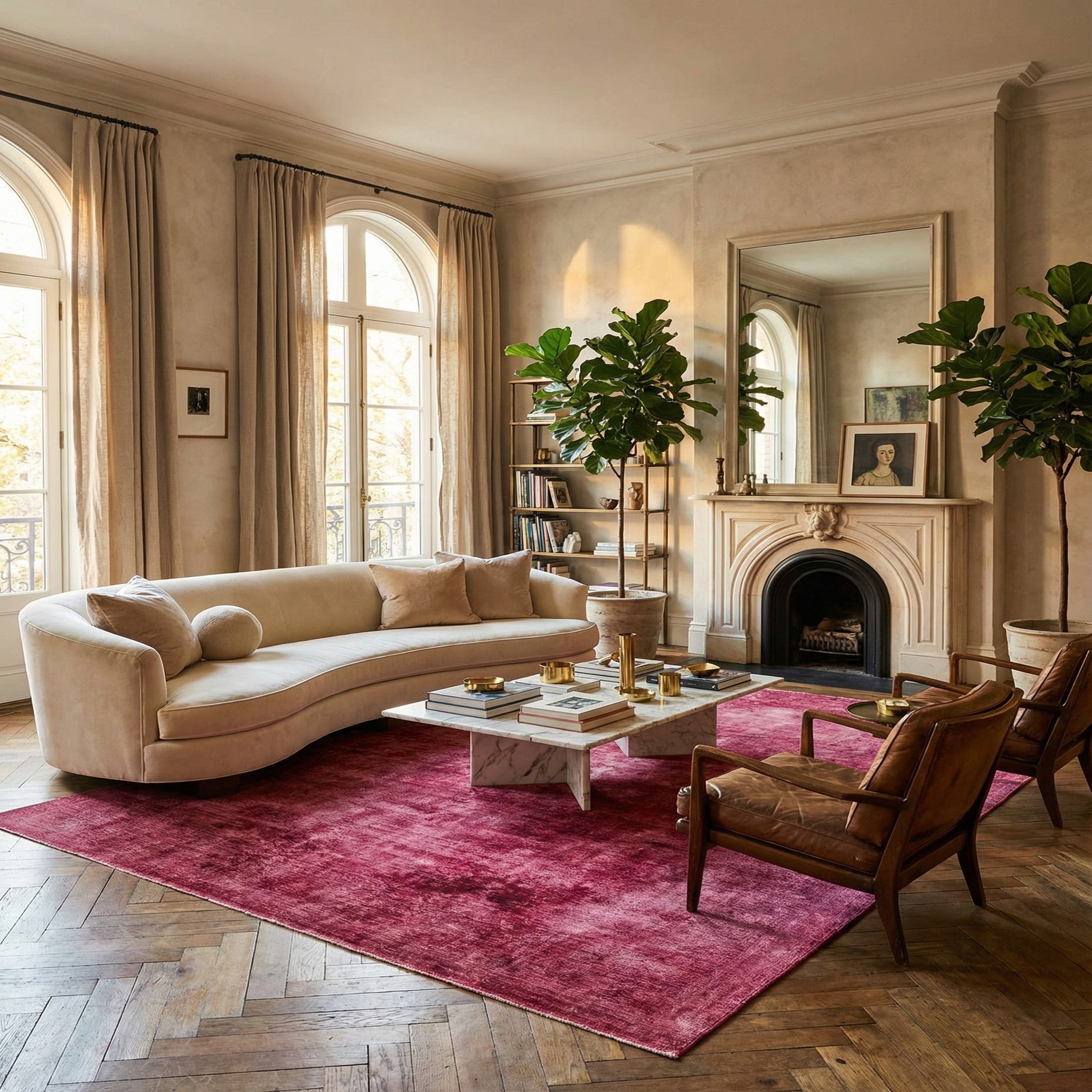 Primary color is Magenta. Colors in this rug include: Magenta, Burgundy.