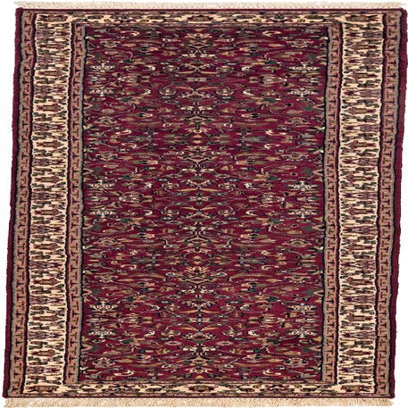 Primary color is Magenta. Colors in this rug include: Magenta, Black, Blue, Brown, Ivory, Olive, Light Brown, Navy Blue.