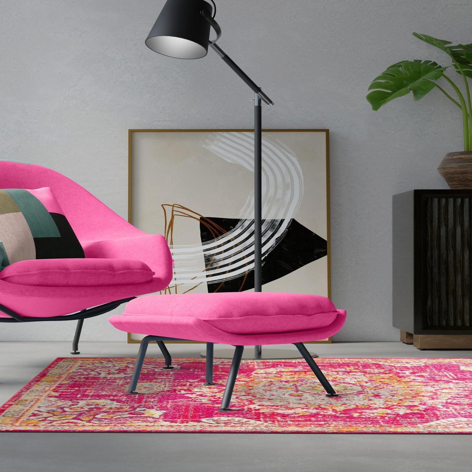 Primary color is Magenta. Colors in this rug include: Magenta, Beige, Gold, Gray, Ivory, Orange, Pink.