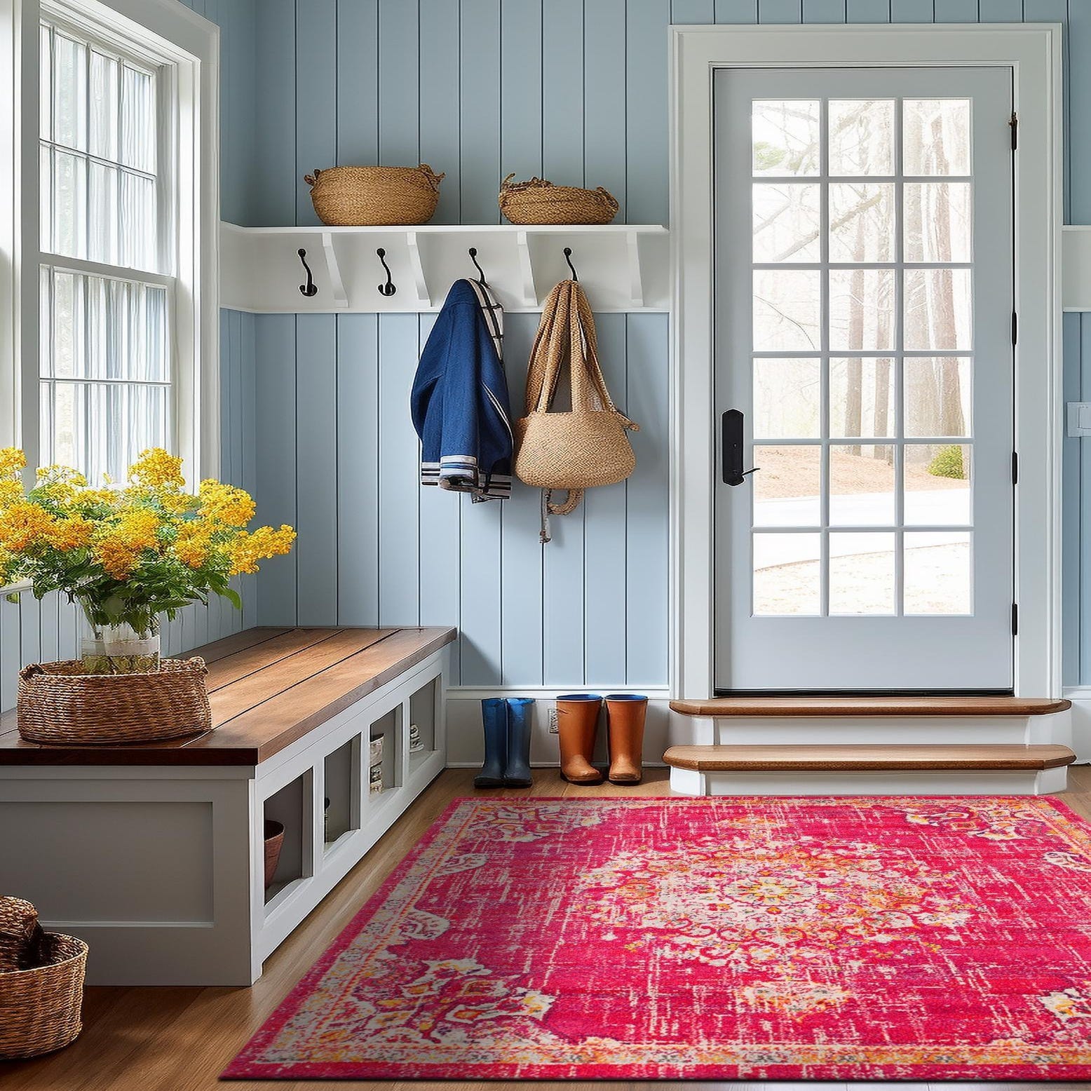 Primary color is Magenta. Colors in this rug include: Magenta, Beige, Gold, Ivory, Orange, Gray, Pink.