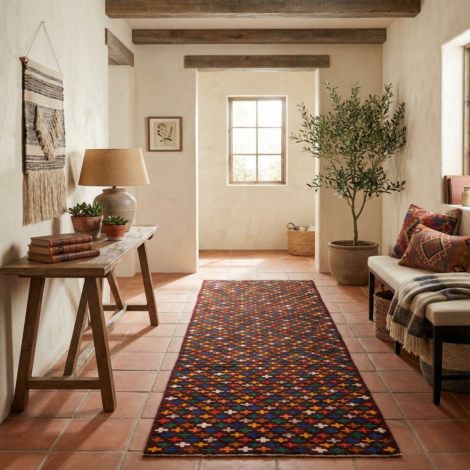 Primary color is Maroon. Colors in this rug include: Maroon, Blue, Green, Orange, Yellow, Terracotta.