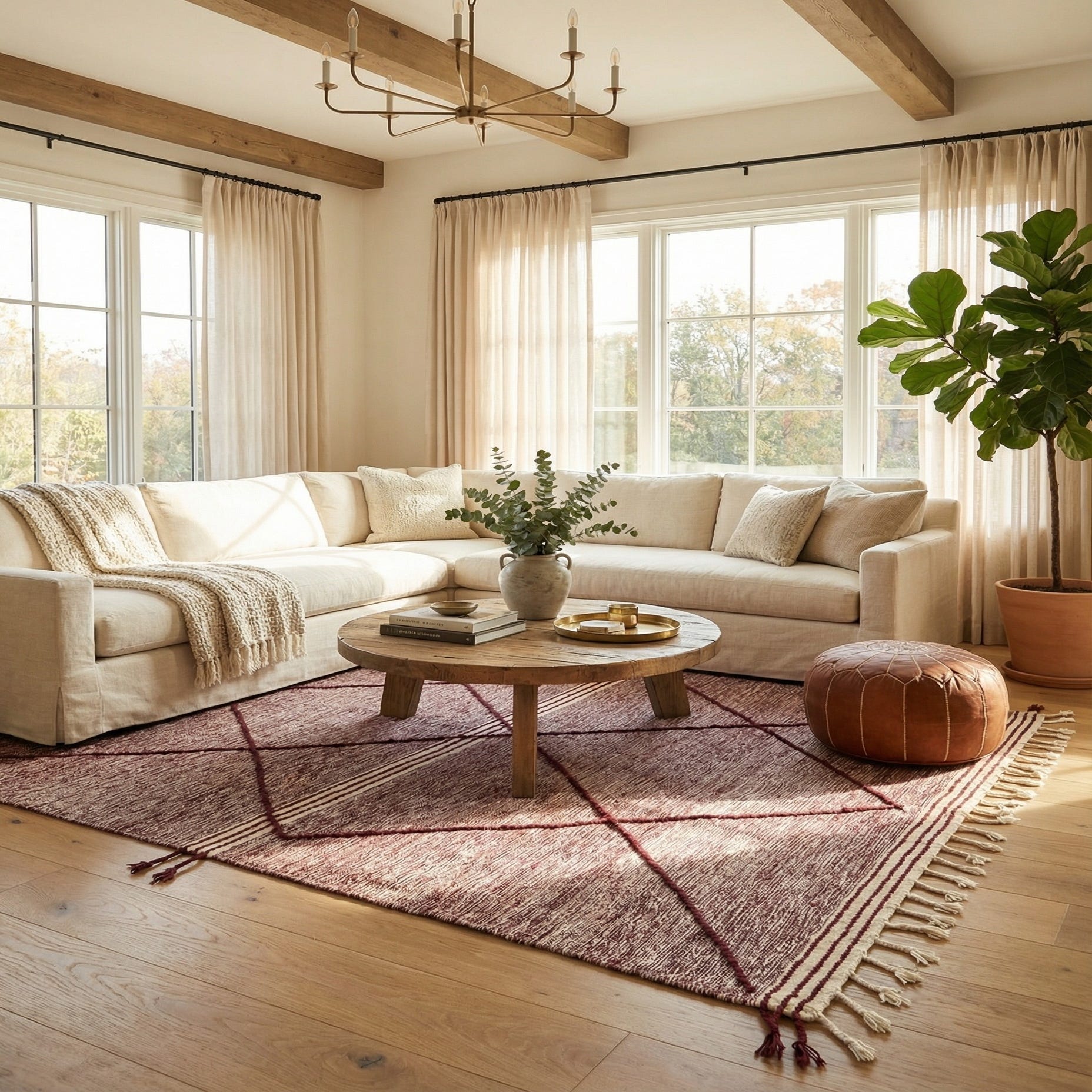 Primary color is Maroon. Colors in this rug include: Maroon, Ivory.