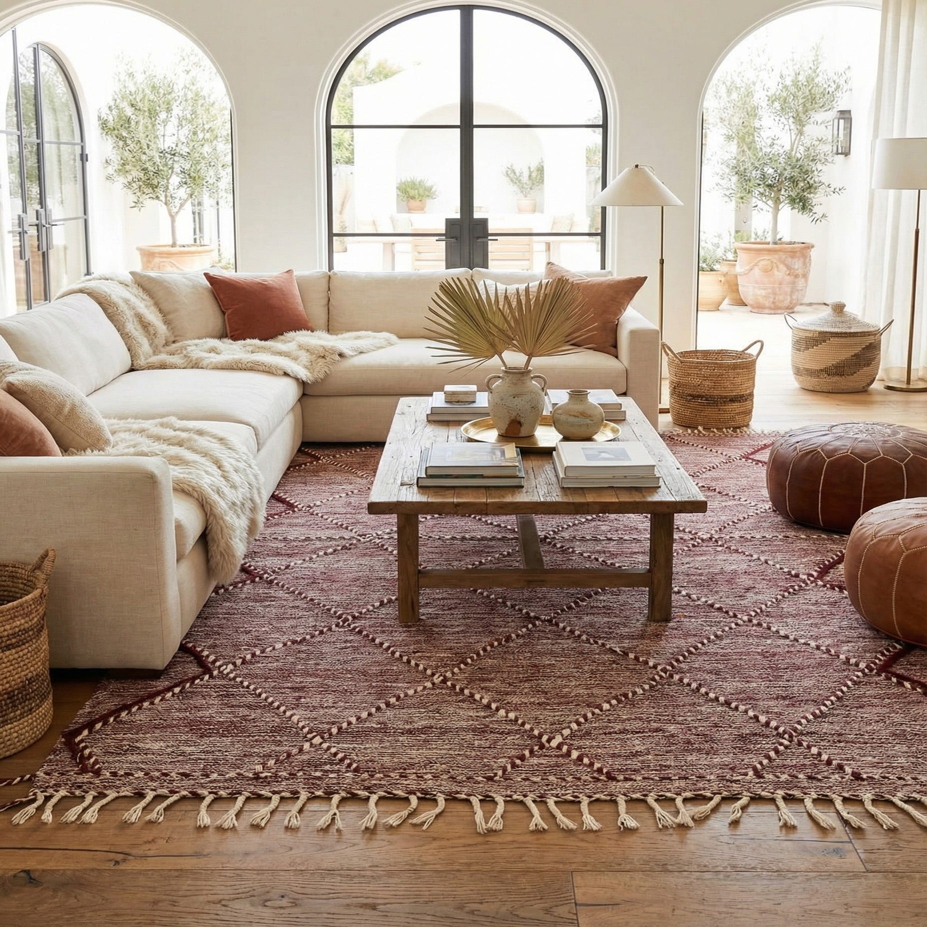 Primary color is Maroon. Colors in this rug include: Maroon, Ivory.