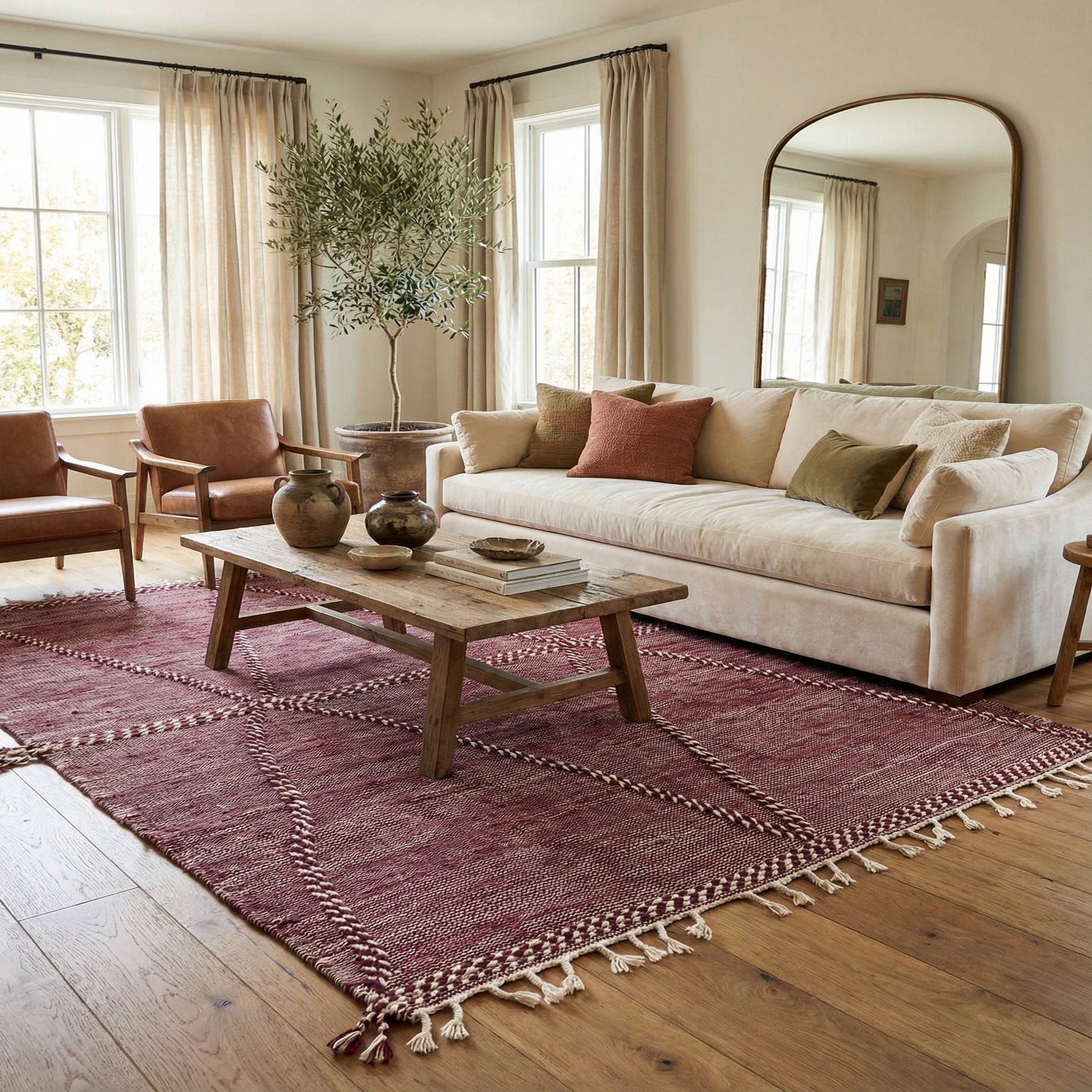 Primary color is Maroon. Colors in this rug include: Maroon, Ivory.