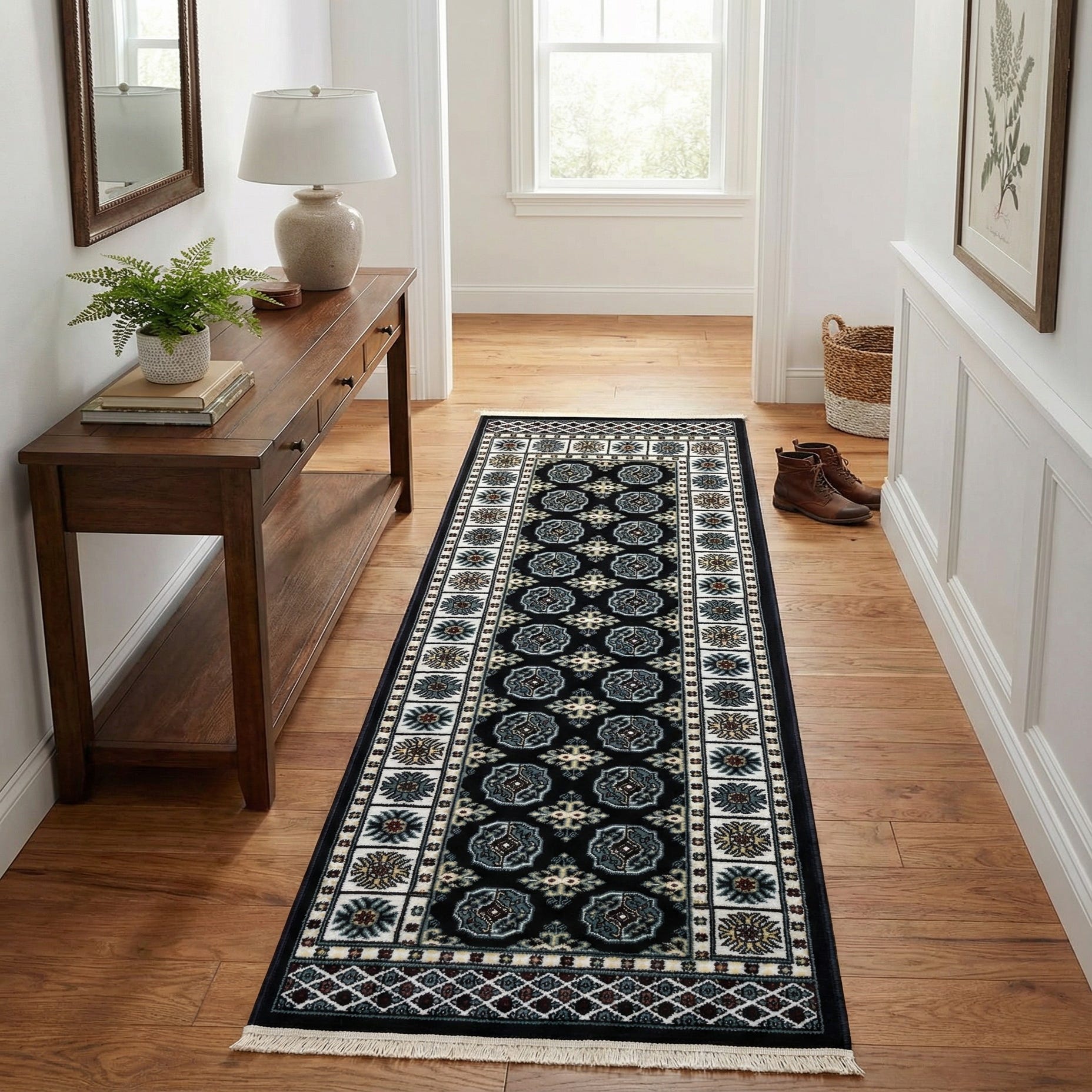 Primary color is Midnight Blue. Colors in this rug include: Midnight Blue, Ivory, Red, Light Blue.