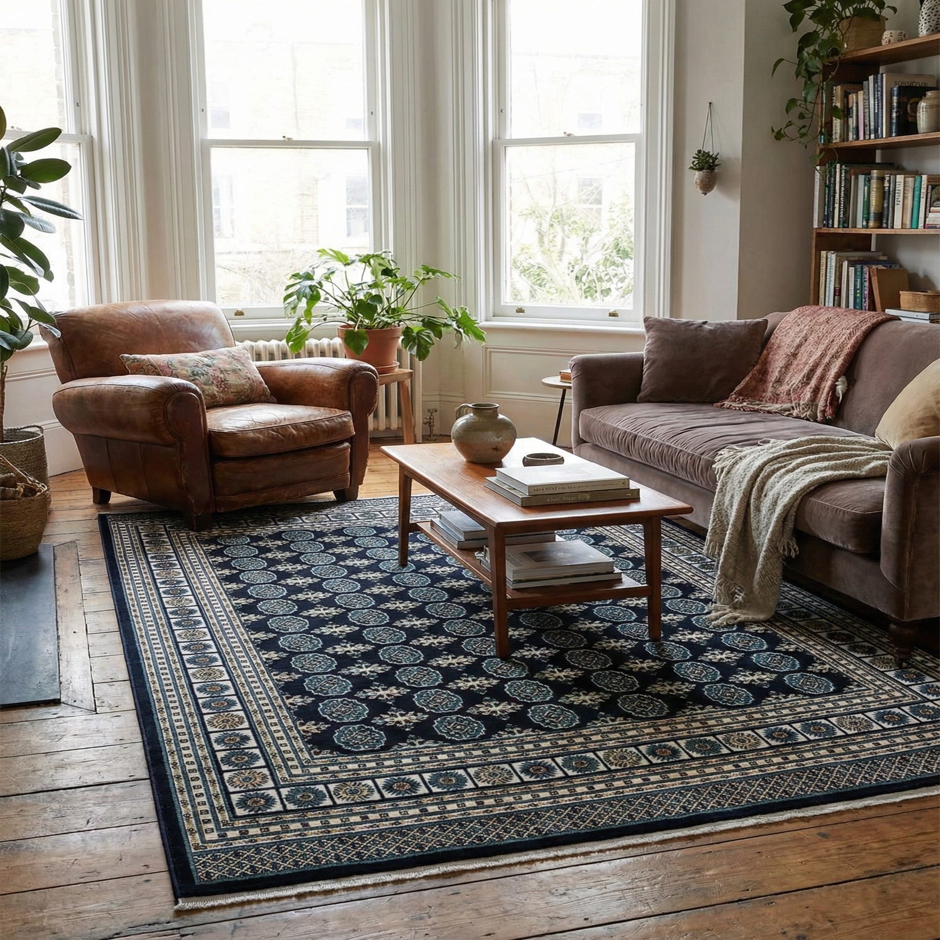 Primary color is Midnight Blue. Colors in this rug include: Midnight Blue, Blue, Ivory, Navy Blue, Red.