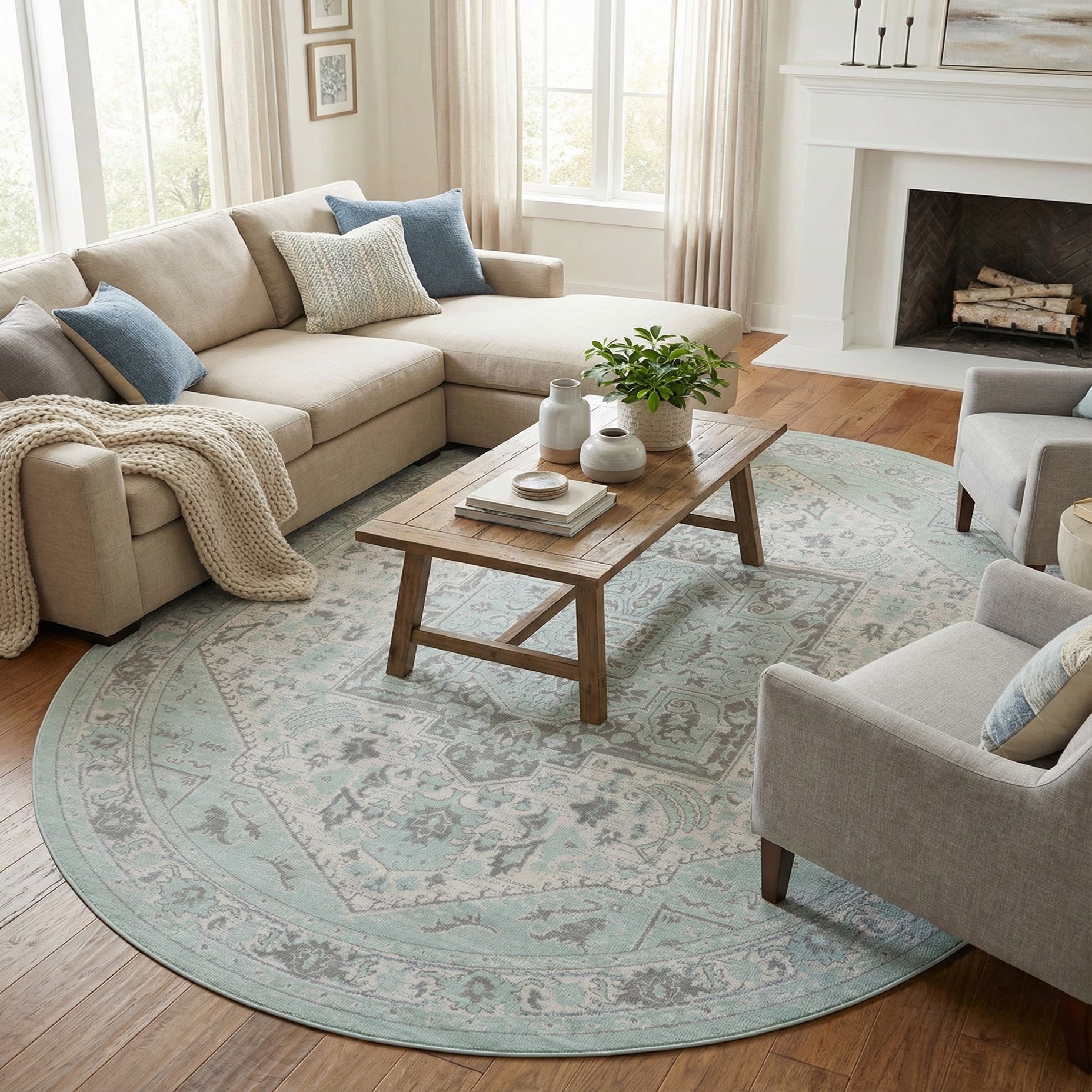 Primary color is Mint. Colors in this rug include: Mint, Gray, Ivory, Light Blue.