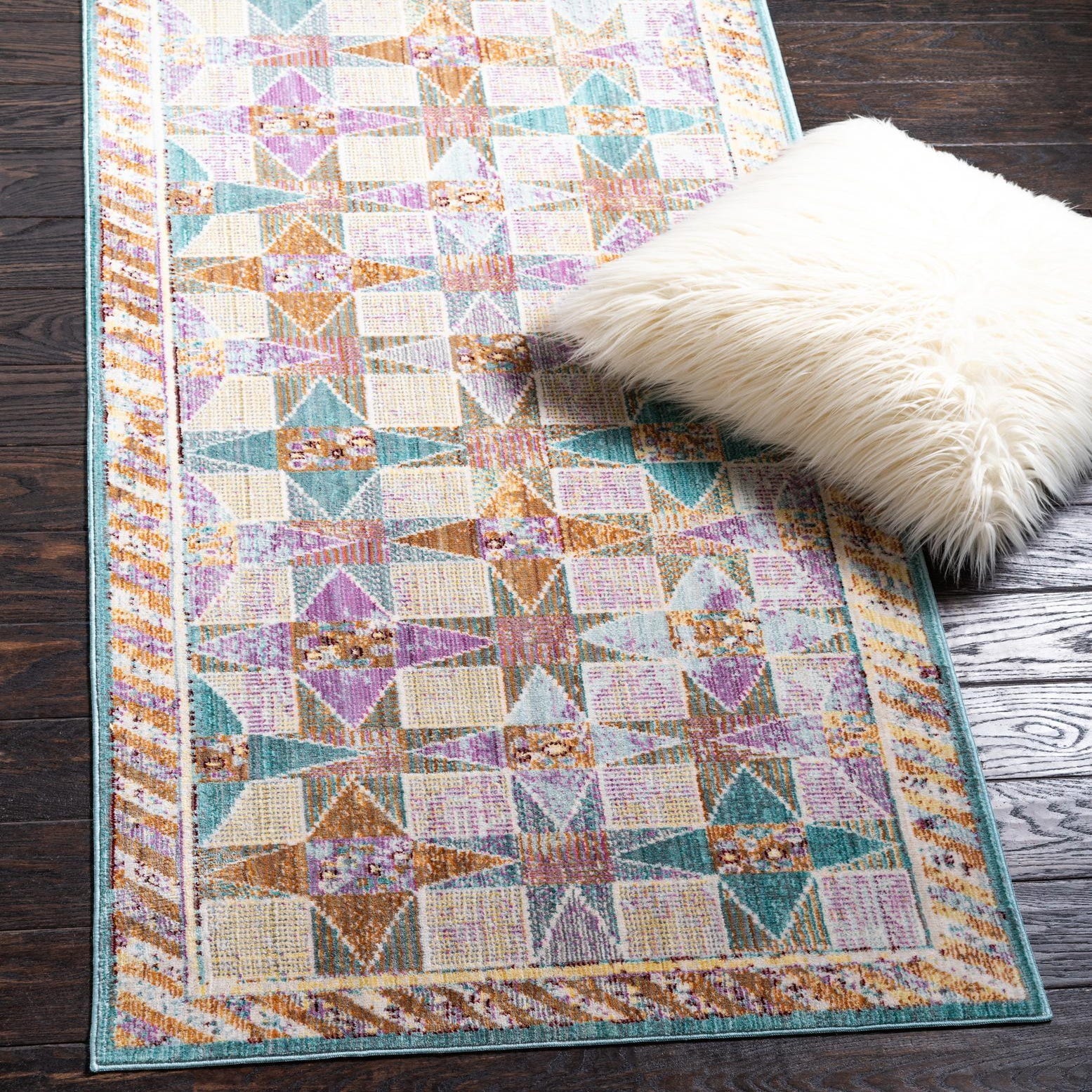 Primary color is Multi. Colors in this rug include: Multi, Cream, Light Blue, Light Green, Peach, Puce, Purple, Burgundy.