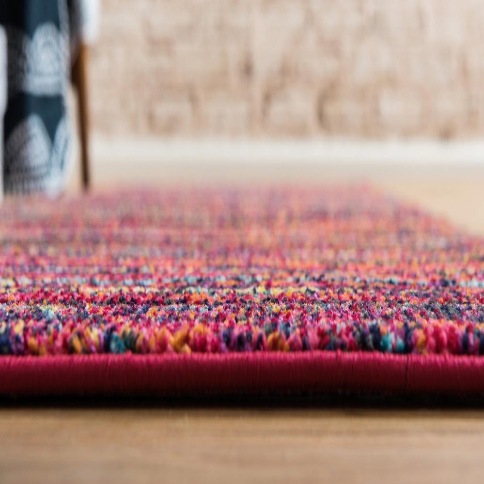 Primary color is Multi. Colors in this rug include: Multi, Blue, Light Blue, Light Green, Navy Blue, Orange, Puce, Purple, Red.