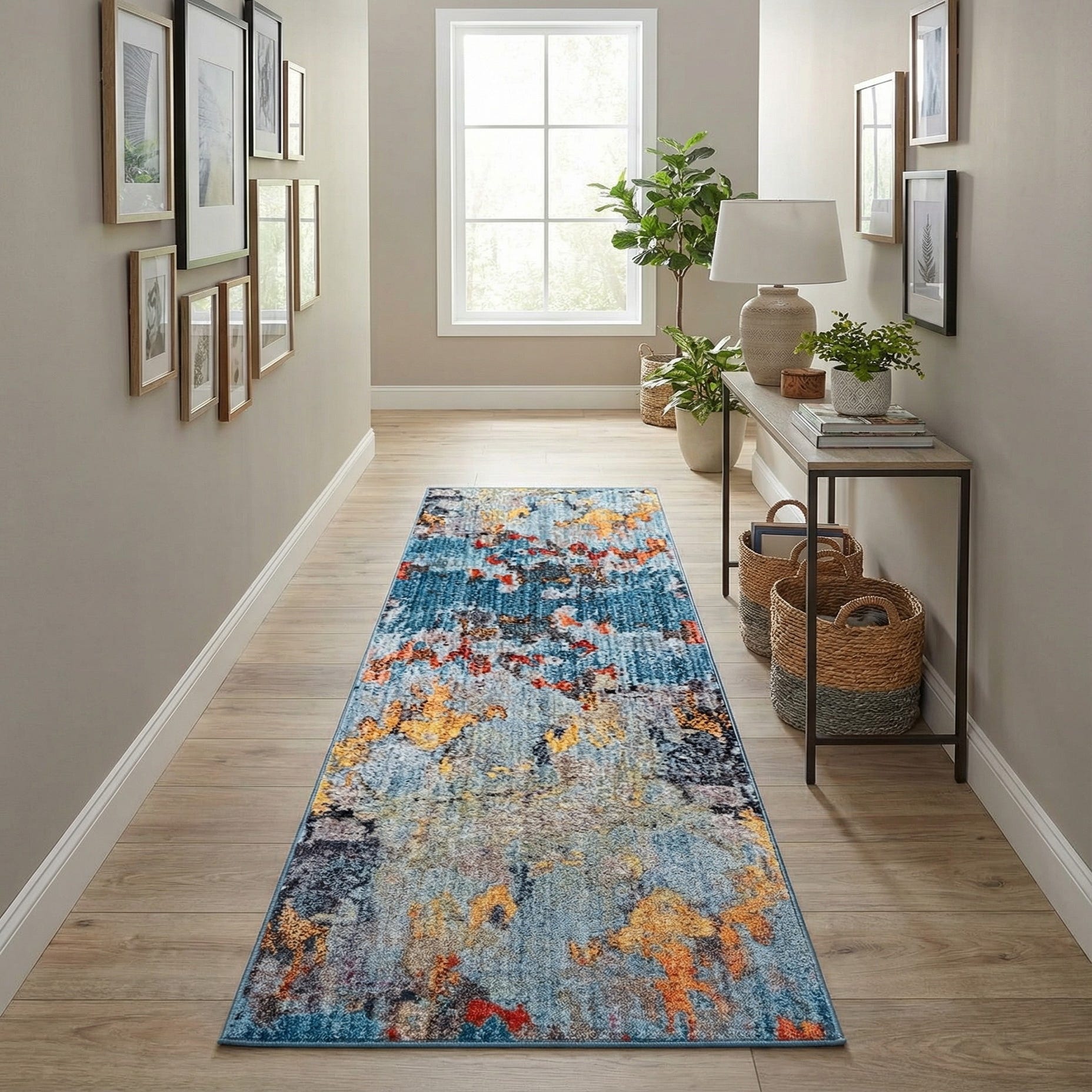 Primary color is Multi. Colors in this rug include: Multi, Black, Blue, Cream, Gray, Light Blue, Orange, Peach, Yellow.