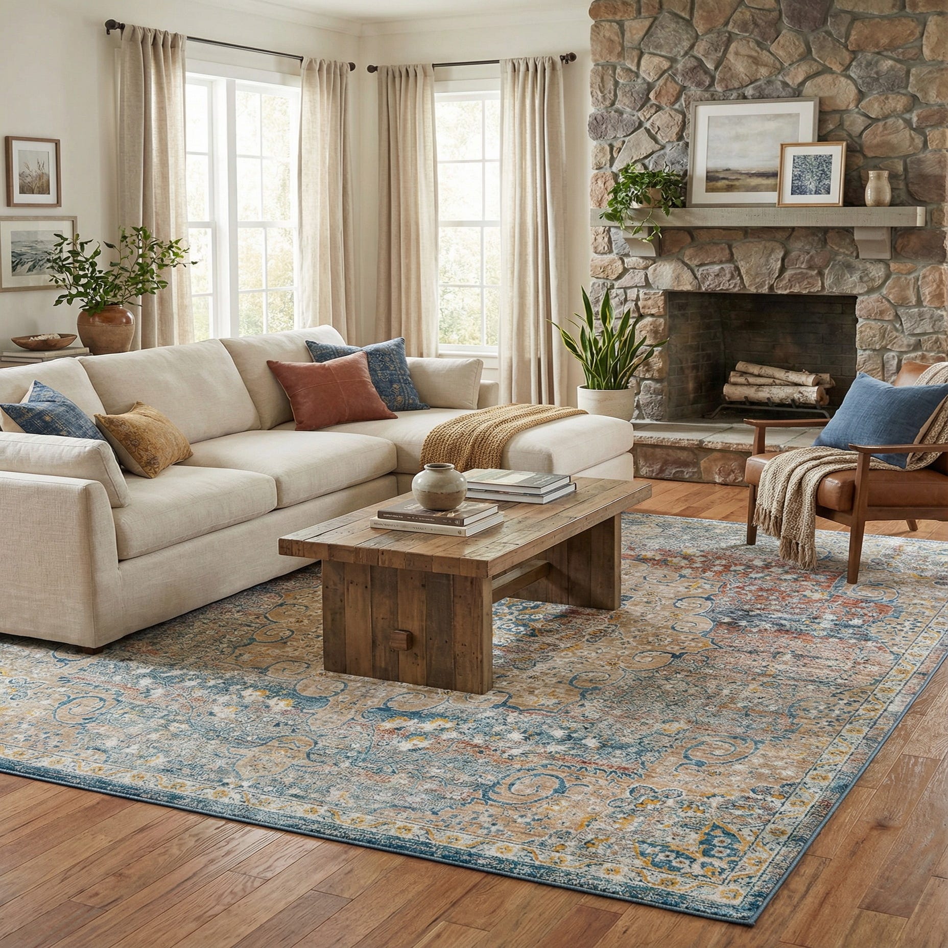 Primary color is Multi. Colors in this rug include: Multi, Blue, Gray, Ivory, Light Blue, Light Brown, Rust Red, Terracotta.