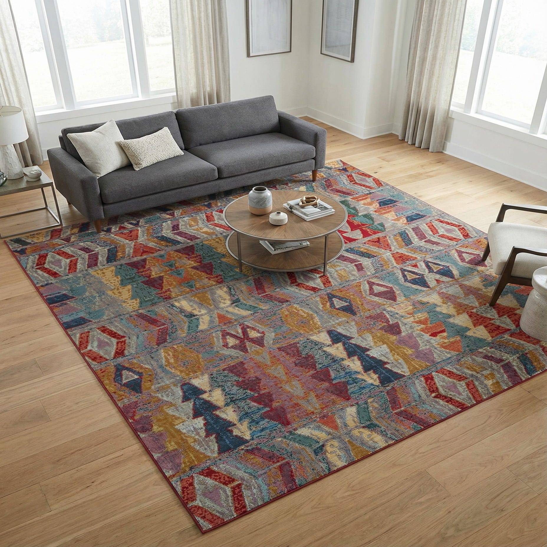 Primary color is Multi. Colors in this rug include: Multi, Blue, Light Blue, Light Green, Olive, Orange, Peach, Tan, Terracotta, Yellow, Red, Rust Red, Violet.