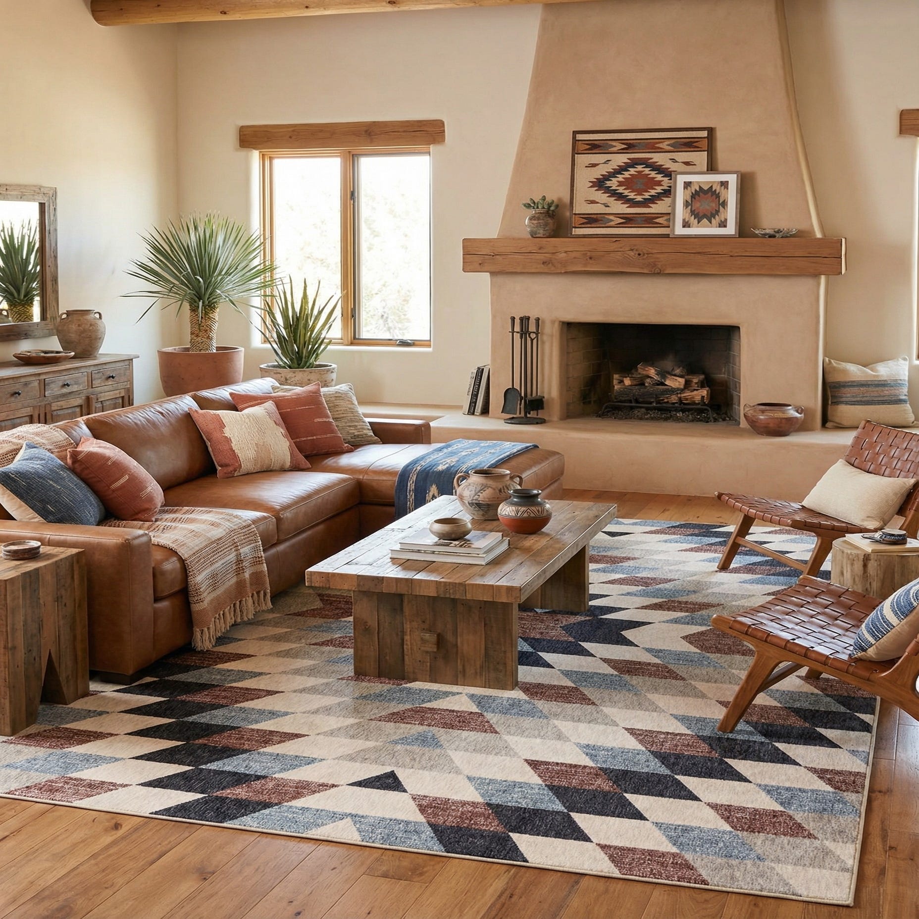 Primary color is Multi. Colors in this rug include: Multi, Black, Gray, Ivory, Light Blue, Rust Red.