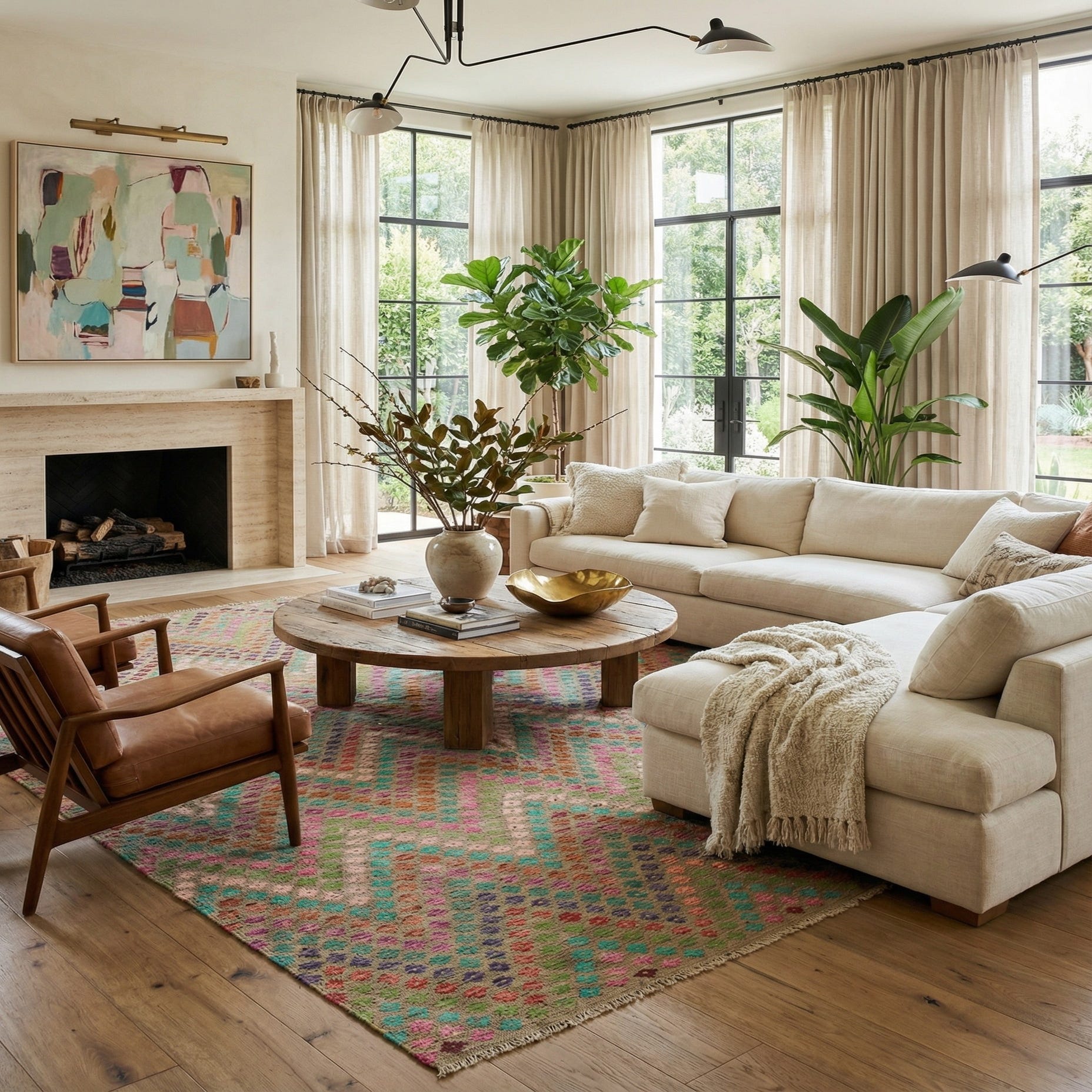 Primary color is Multi. Colors in this rug include: Multi, Beige, Blue, Brown, Gray, Green, Navy Blue, Olive, Red, Purple, Terracotta, Pink.