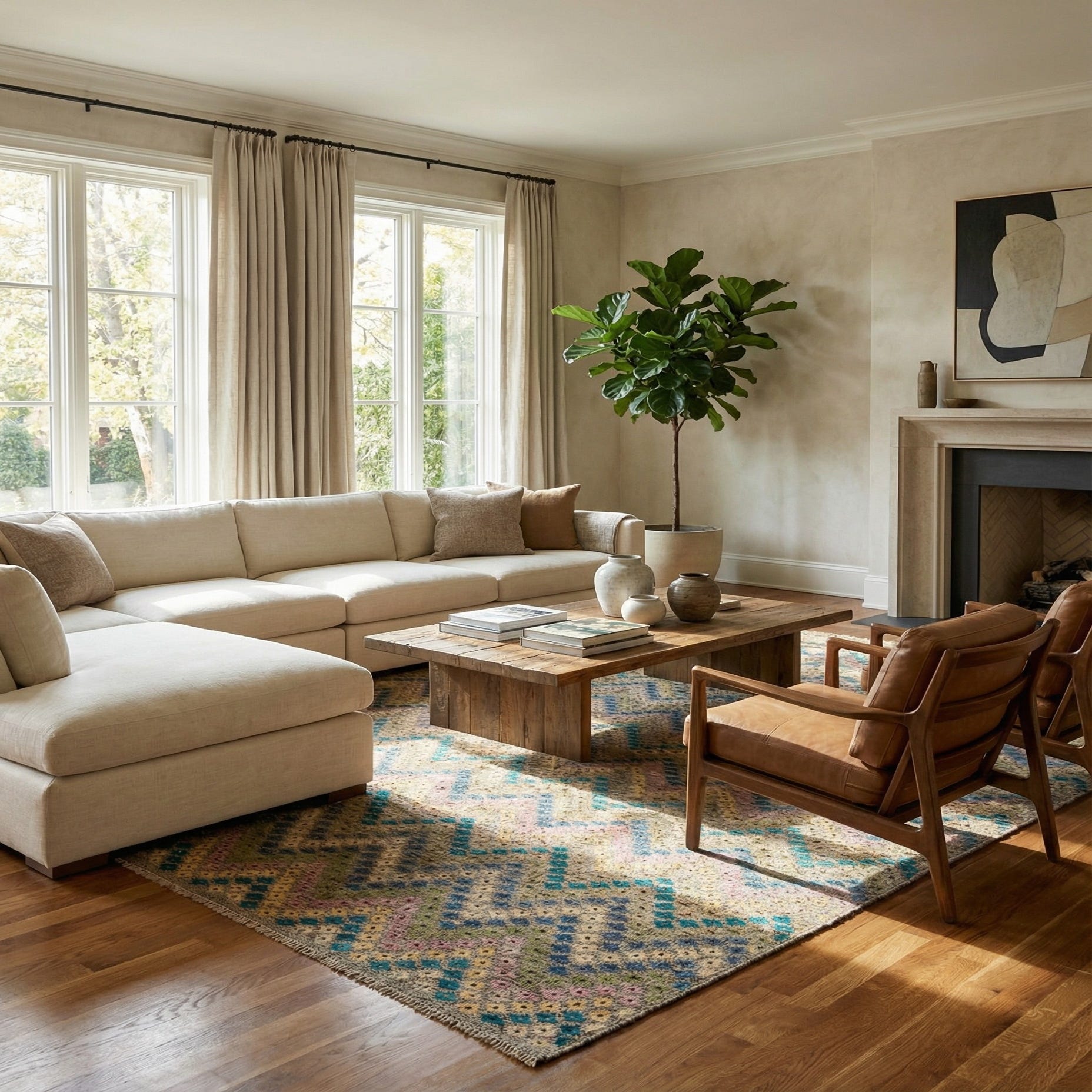 Primary color is Multi. Colors in this rug include: Multi, Beige, Blue, Brown, Olive, Violet, Navy Blue.
