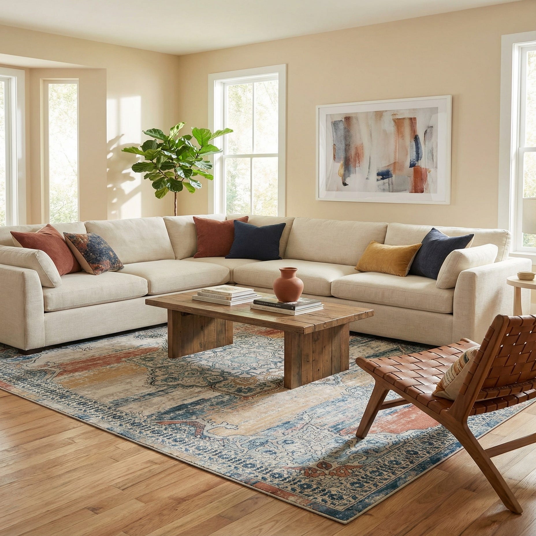 Primary color is Multi. Colors in this rug include: Multi, Black, Blue, Gray, Rust Red, Ivory.