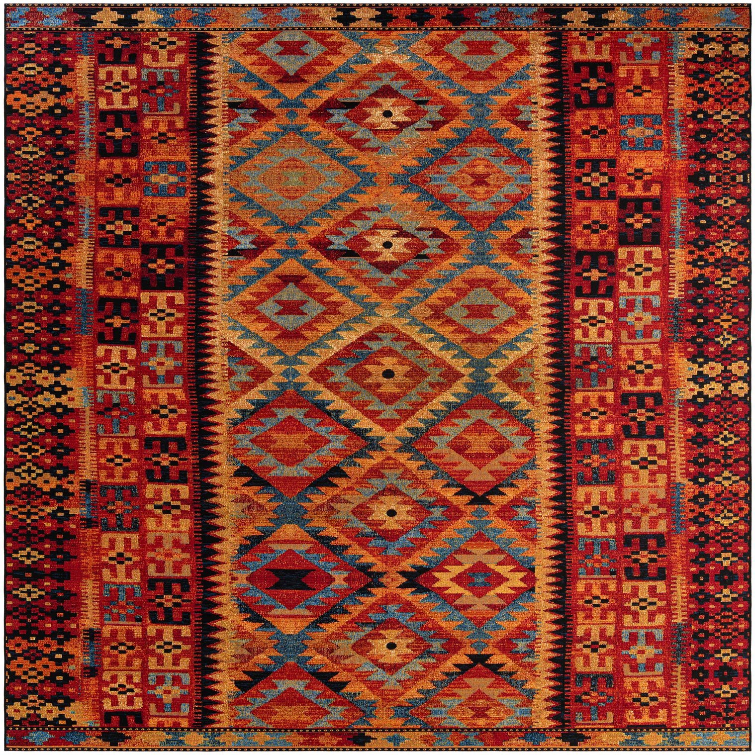 Primary color is Multi. Colors in this rug include: Multi, Blue, Navy Blue, Orange, Red, Rust Red, Tan, Terracotta, Light Blue, Light Brown, Peach.