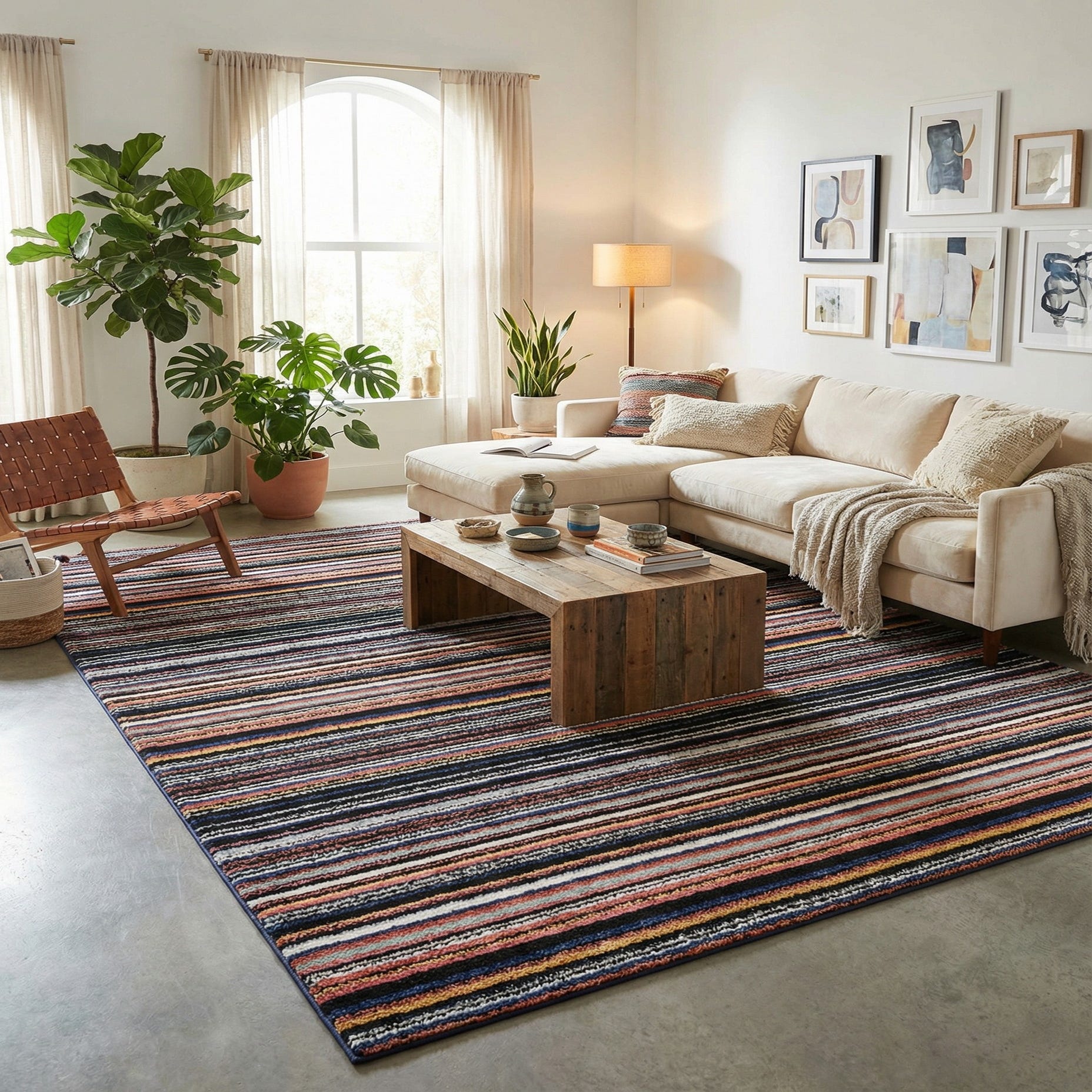 Primary color is Multi. Colors in this rug include: Multi, Black, Blue, Ivory, Light Blue, Peach, Yellow, Pink, Navy Blue.