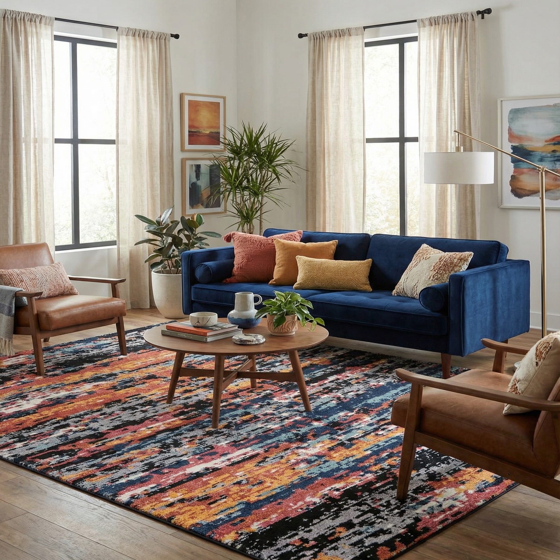 Primary color is Multi. Colors in this rug include: Multi, Black, Gray, Ivory, Navy Blue, Orange, Peach.