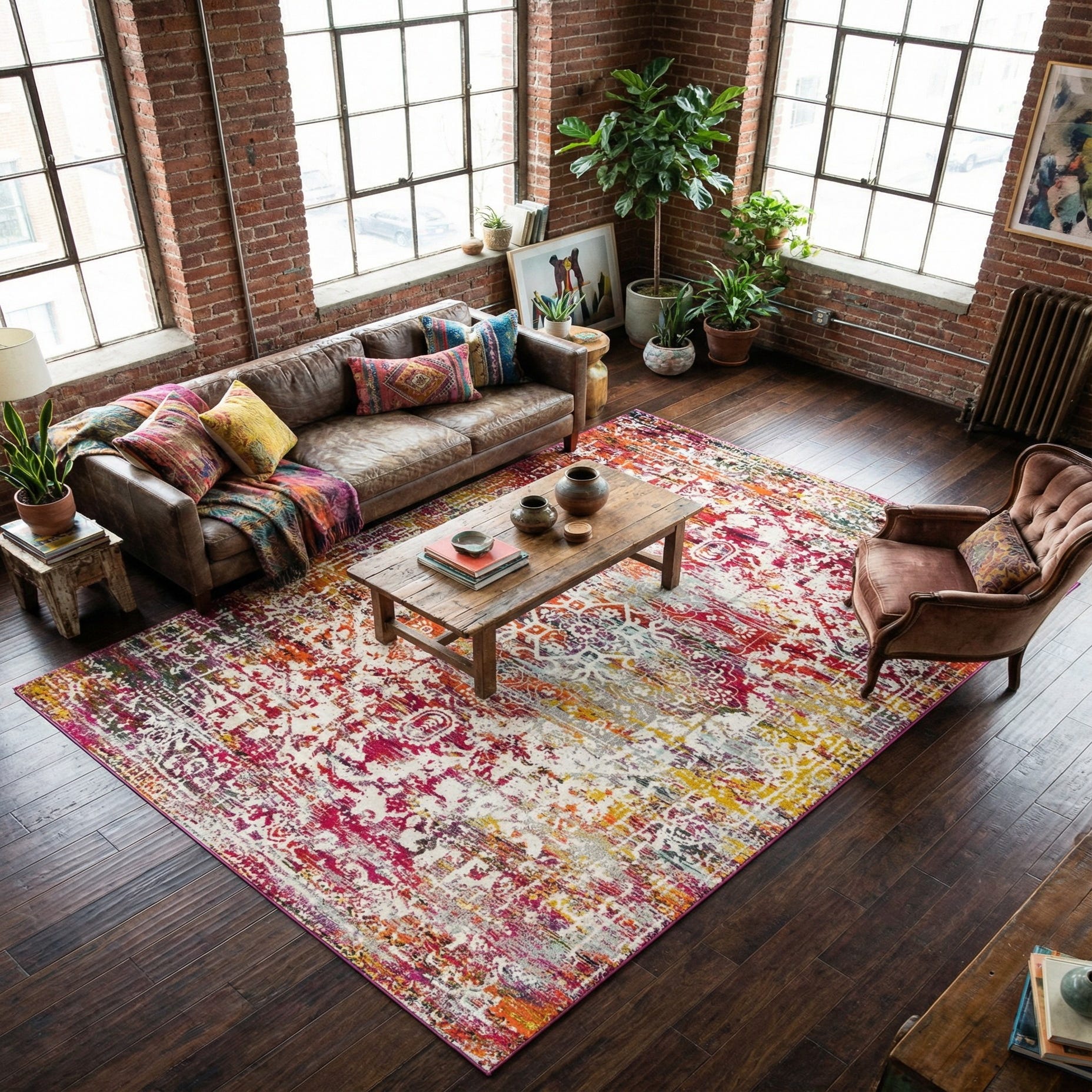 Primary color is Multi. Colors in this rug include: Multi, Black, Gray, Ivory, Orange, Red, Yellow.