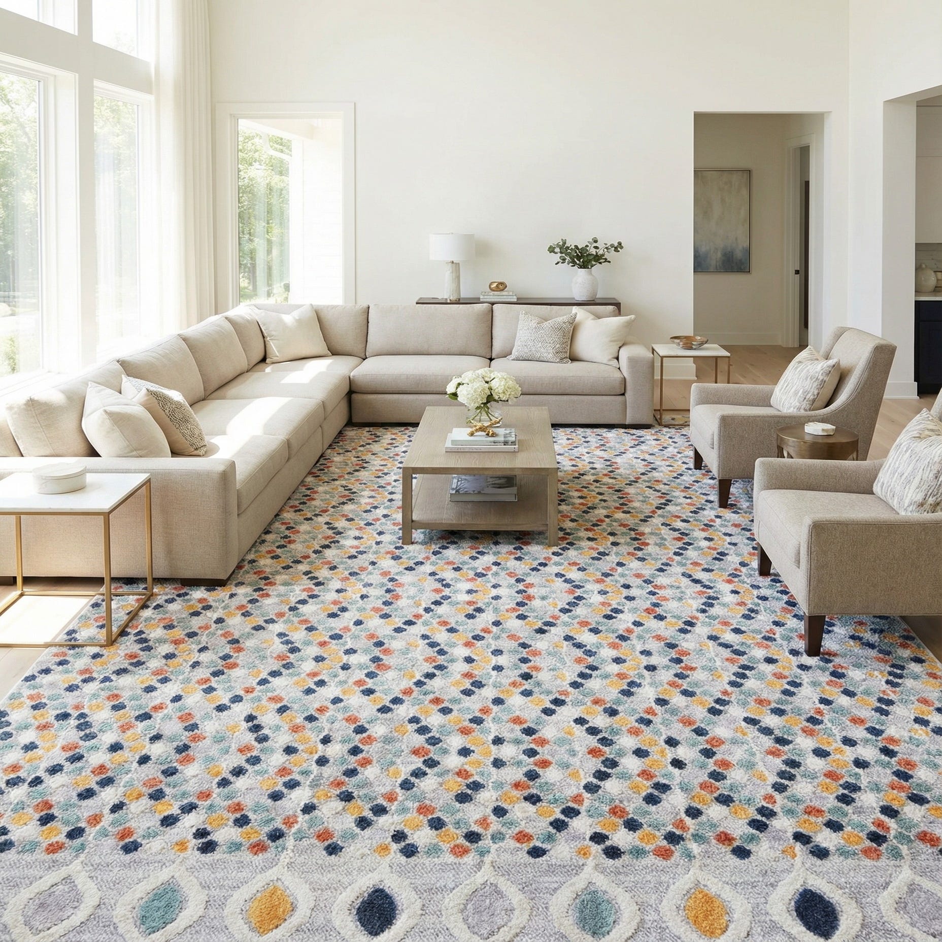 Primary color is Multi. Colors in this rug include: Multi, Gray, Ivory, Navy Blue, Yellow, Green.