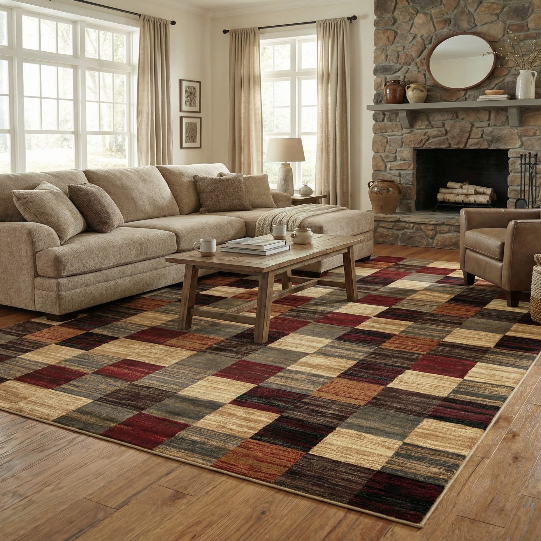 Primary color is Multi. Colors in this rug include: Multi, Beige, Black, Blue, Brown, Burgundy, Gray.
