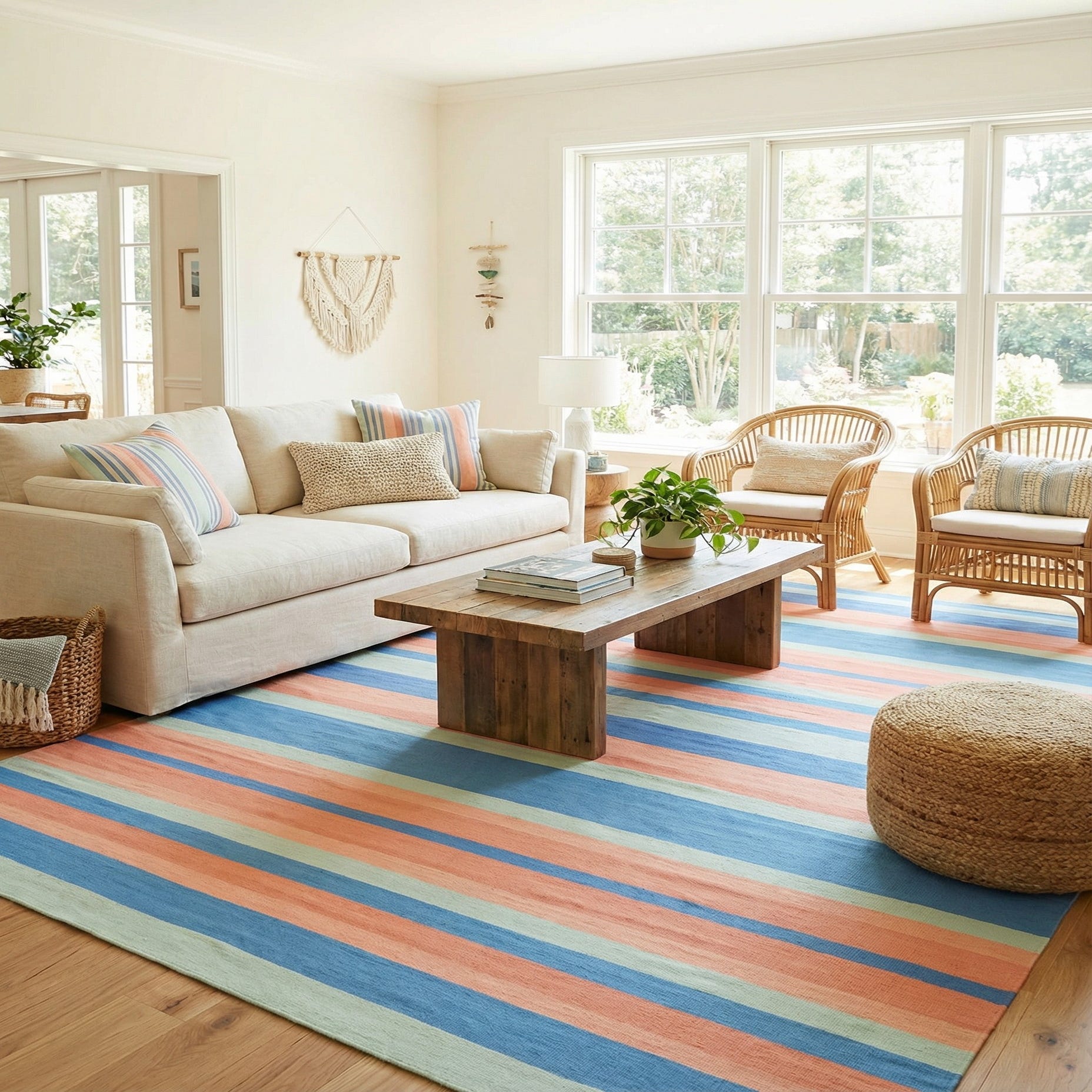 Primary color is Multi. Colors in this rug include: Multi, Light Blue, Light Green, Peach, Pink, Blue.
