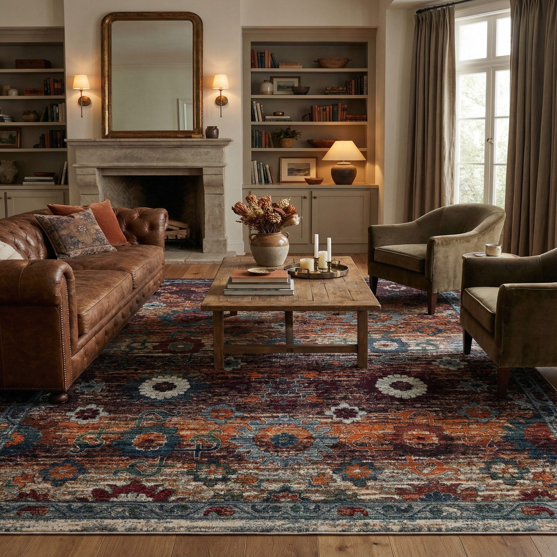 Primary color is Multi. Colors in this rug include: Multi, Beige, Blue, Green, Ivory, Light Blue, Navy Blue, Orange, Peach, Plum Red, Purple, Red.