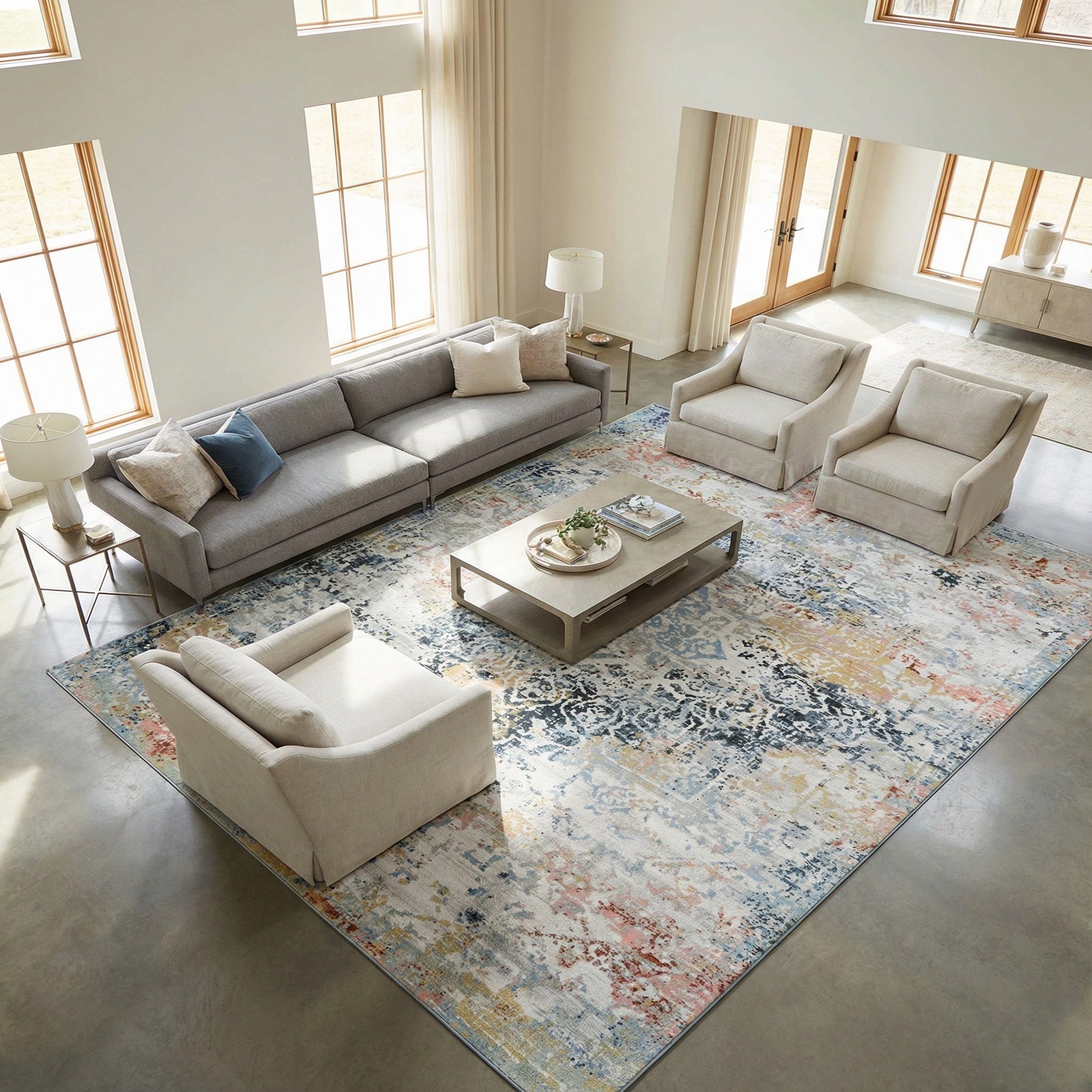 Primary color is Multi. Colors in this rug include: Multi, Blue, Gray, Ivory, Navy Blue, Rust Red, Pink.