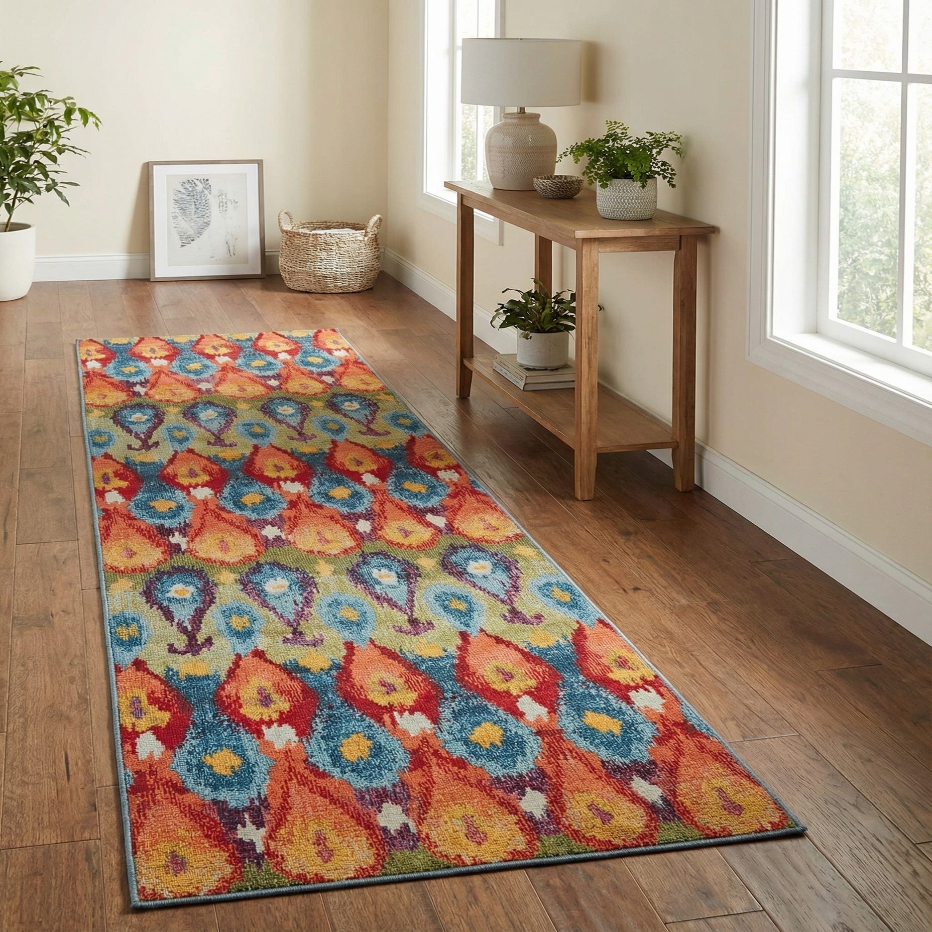 Primary color is Multi. Colors in this rug include: Multi, Blue, Gold, Green, Navy Blue, Orange, Red.