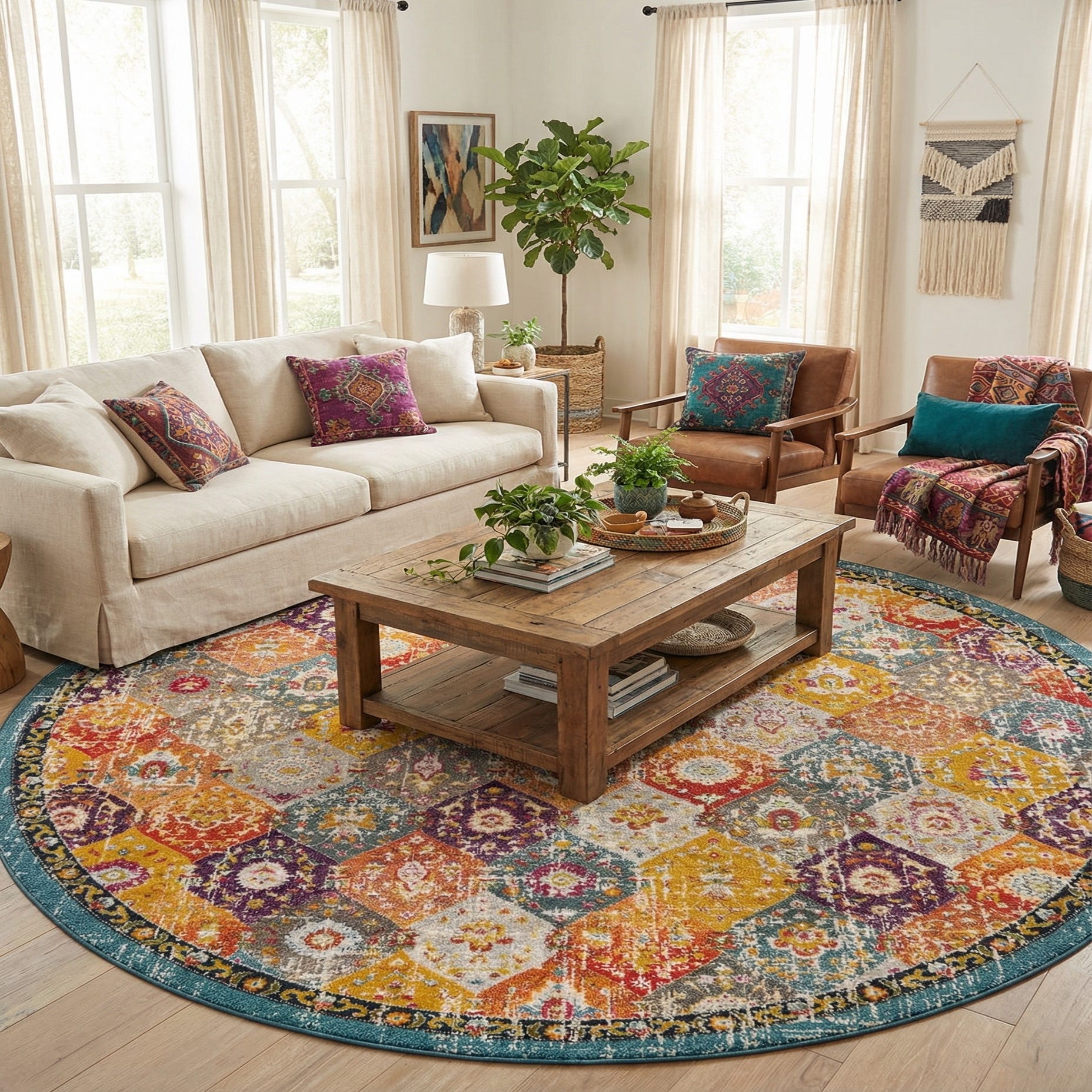 Primary color is Multi. Colors in this rug include: Multi, Blue, Gold, Gray, Green, Orange, Peach, Purple, Navy Blue, Red, Yellow, Pink.