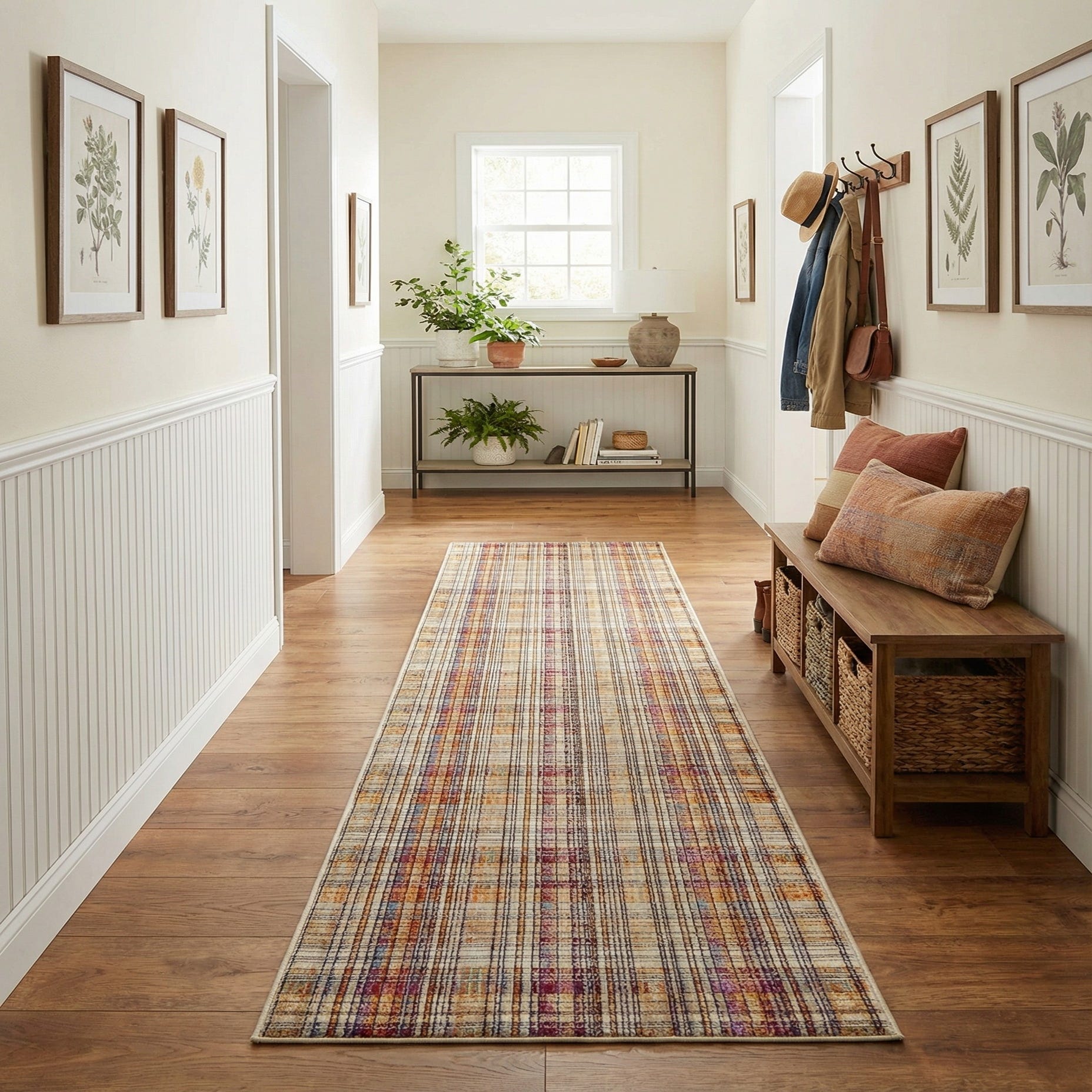 Primary color is Multi. Colors in this rug include: Multi, Beige, Black, Brown, Red, Violet, Gold, Gray.