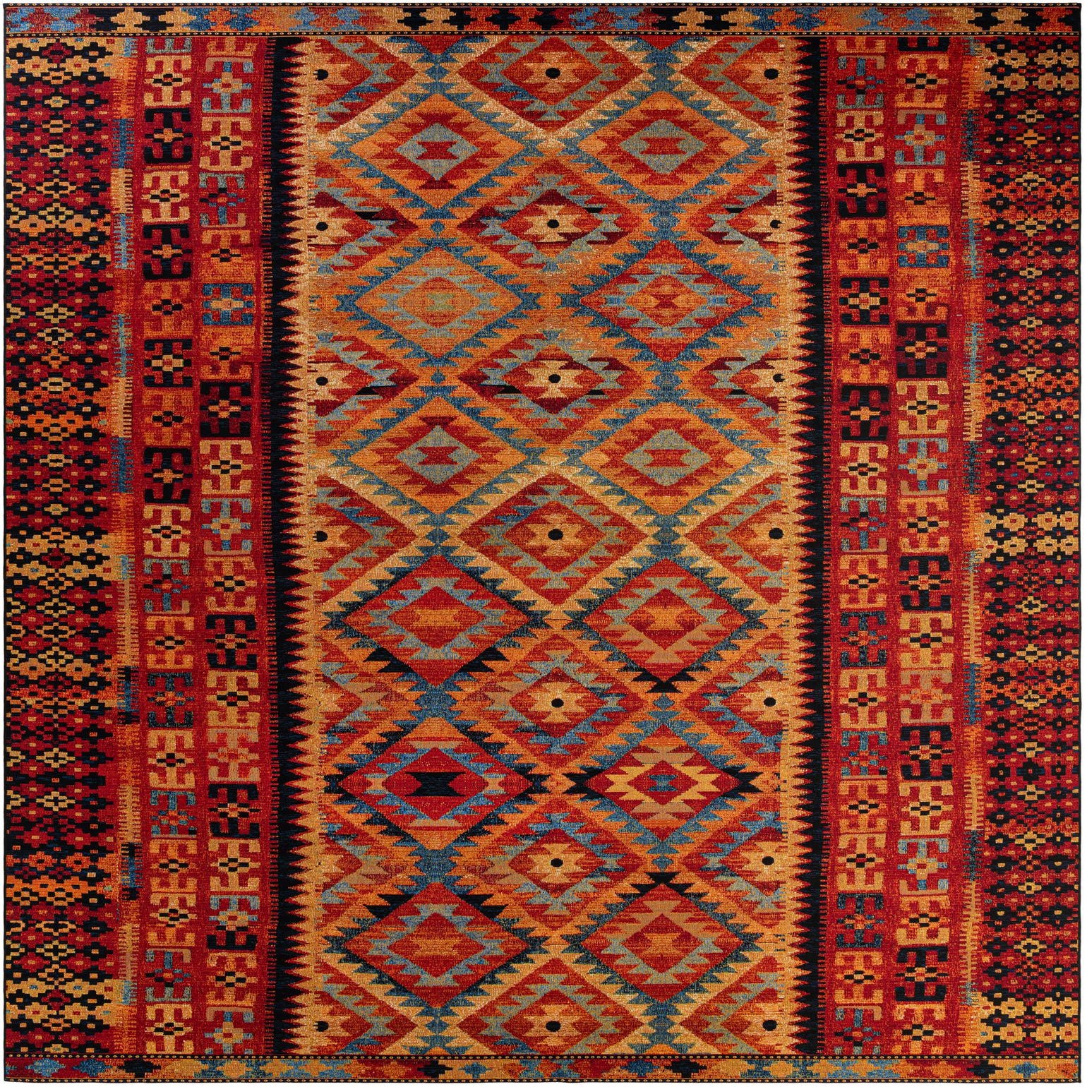 Primary color is Multi. Colors in this rug include: Multi, Blue, Navy Blue, Orange, Red, Rust Red, Tan, Terracotta, Light Blue, Light Brown, Peach.