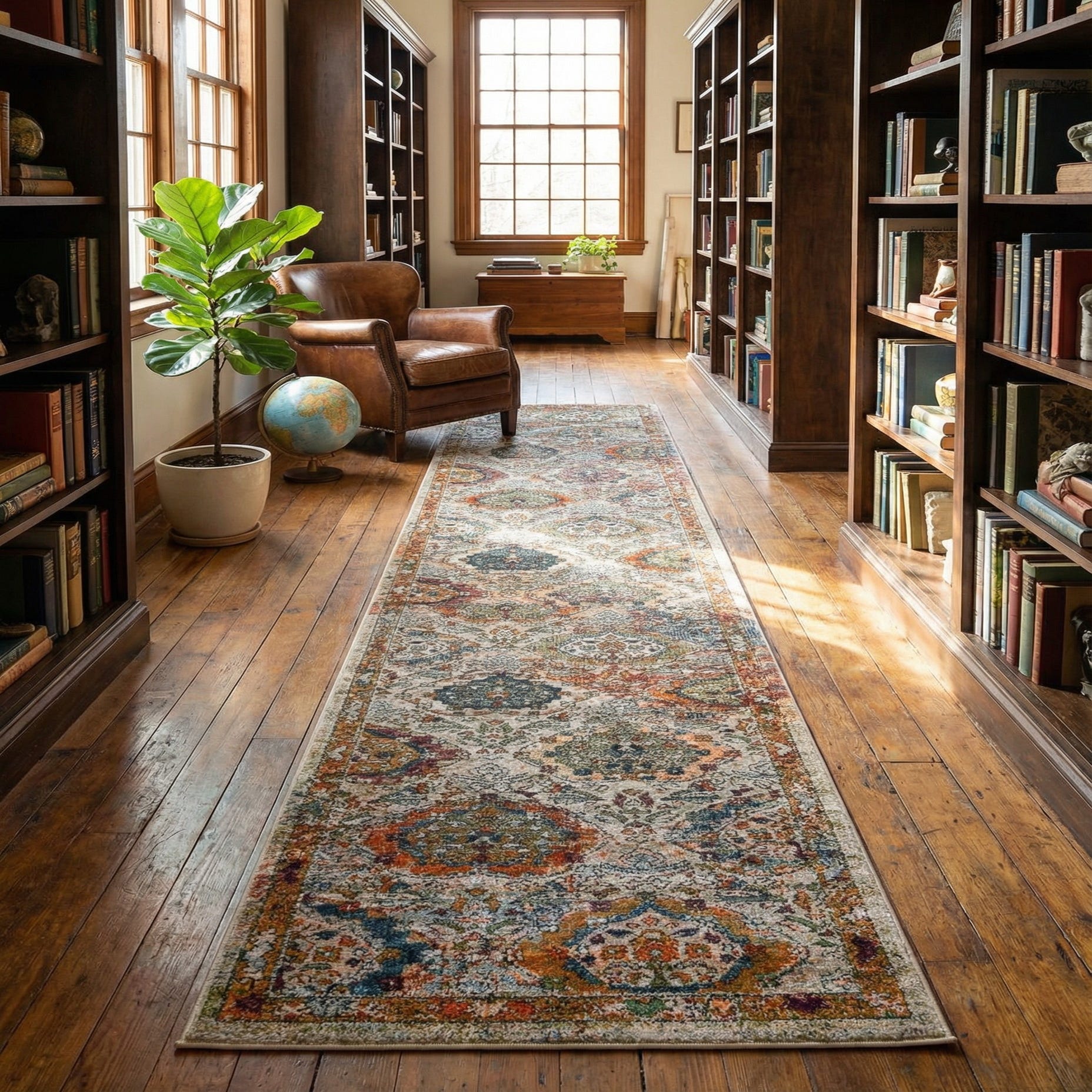 Primary color is Multi. Colors in this rug include: Multi, Beige, Blue, Brown, Green, Ivory, Navy Blue, Orange, Peach, Purple, Red.