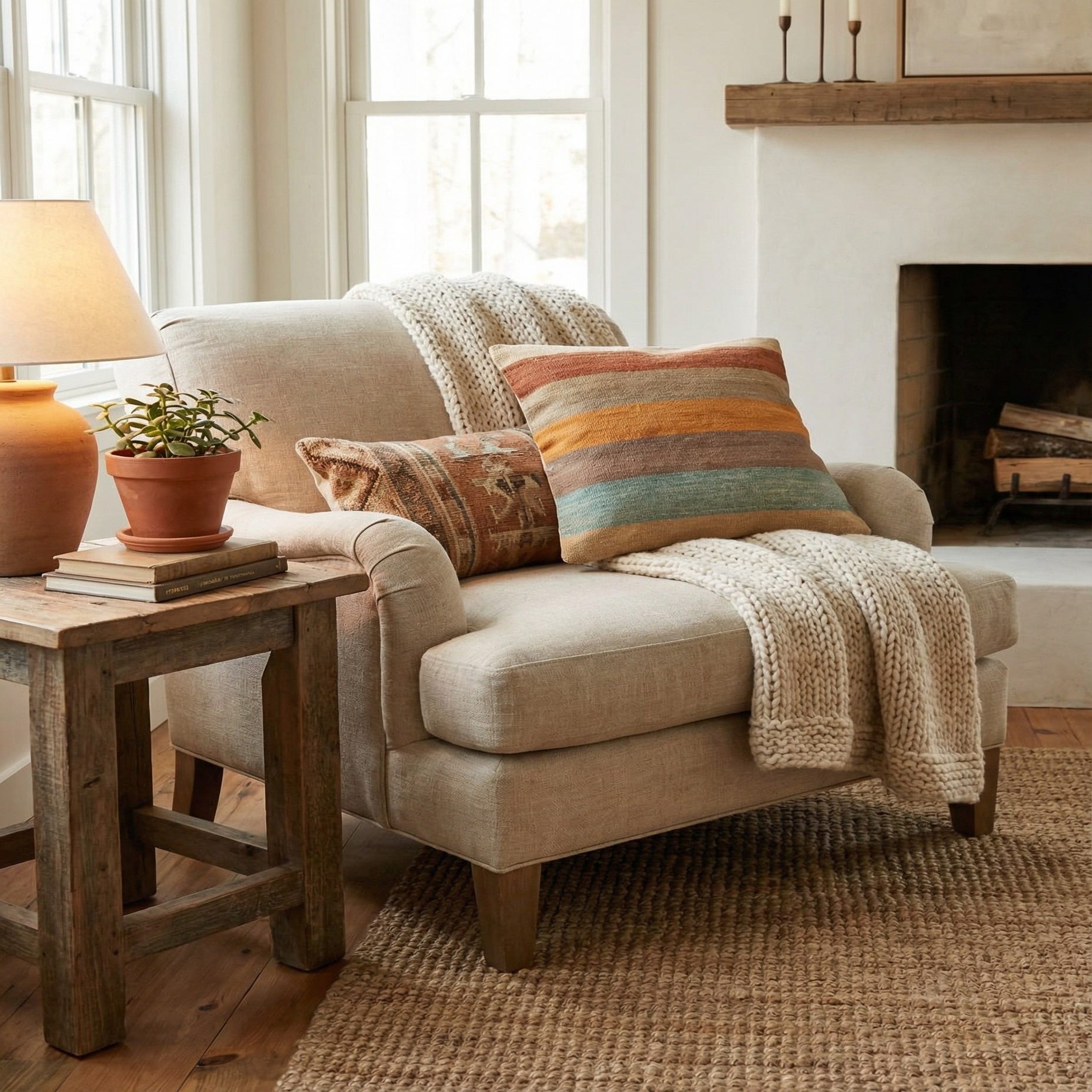 Primary color is Multi. Colors in this rug include: Multi, Beige, Orange, Terracotta, Light Brown, Blue.