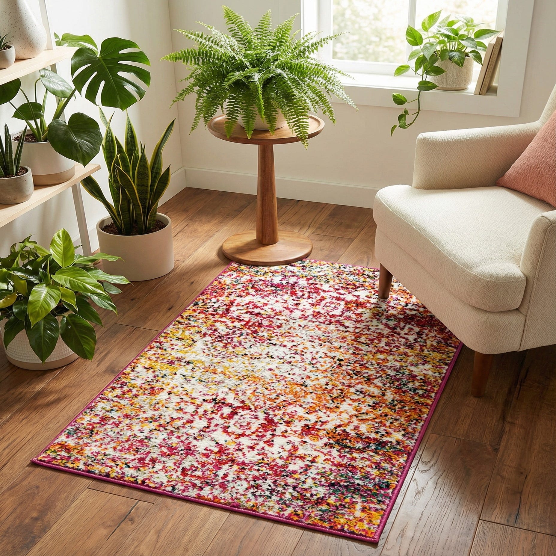 Primary color is Multi. Colors in this rug include: Multi, Black, Gray, Ivory, Orange, Red, Yellow.