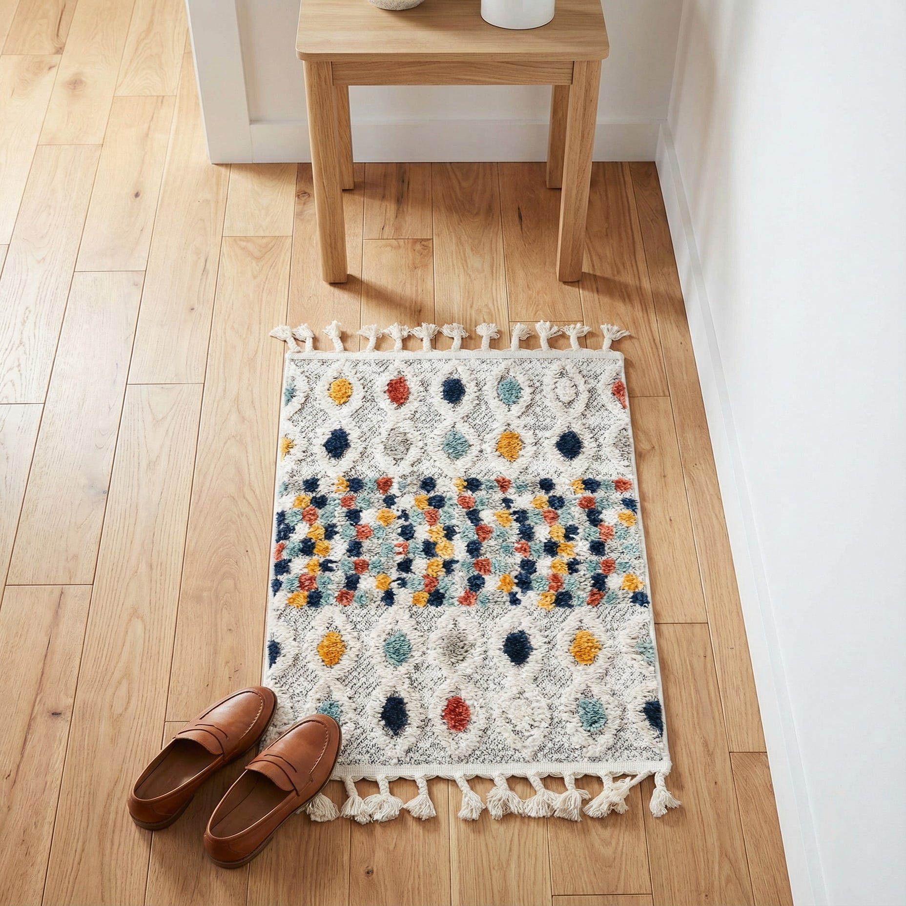 Primary color is Multi. Colors in this rug include: Multi, Gray, Ivory, Navy Blue, Yellow, Red, Blue.