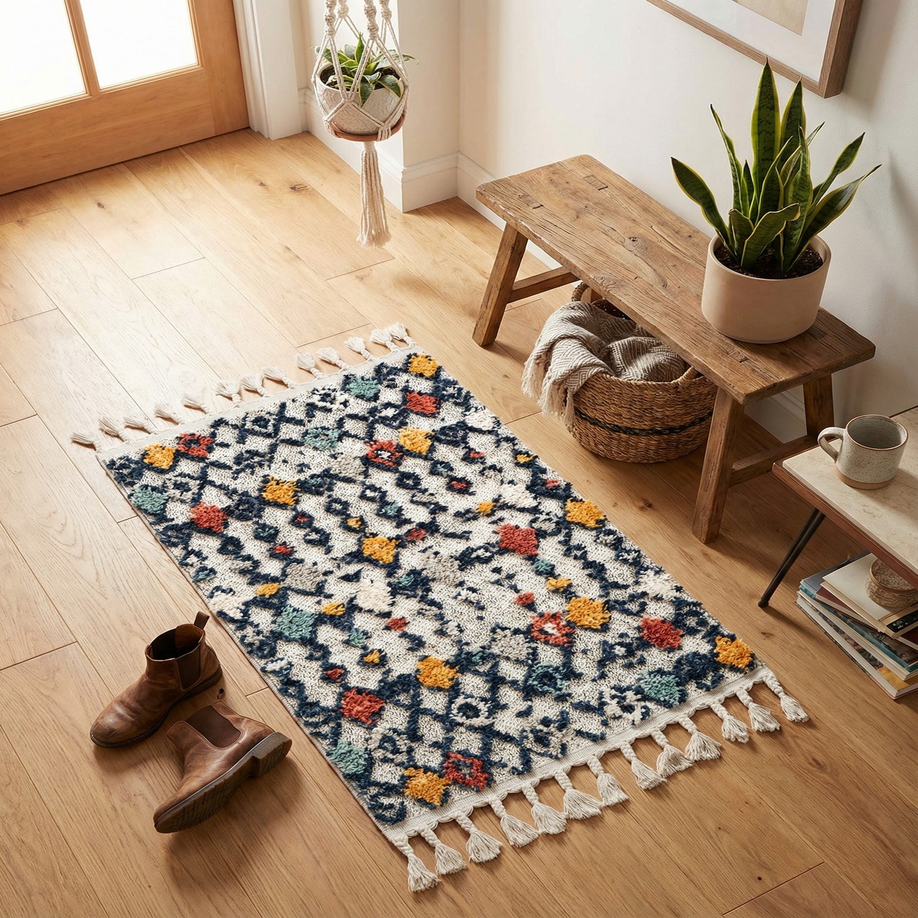 Primary color is Multi. Colors in this rug include: Multi, Ivory, Navy Blue, Red, Gold, Gray.