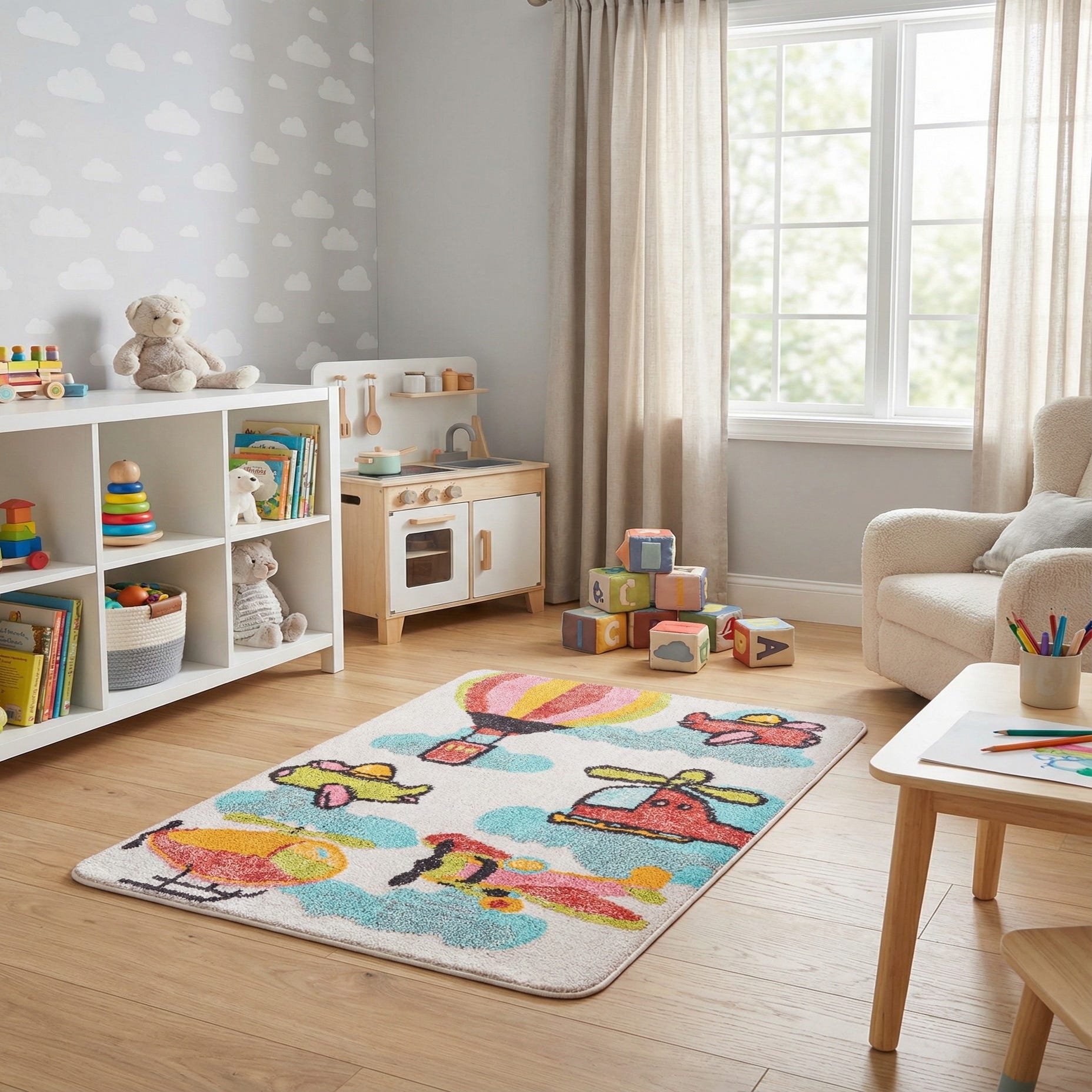 Primary color is Multi. Colors in this rug include: Multi, Beige, Black, Blue, Yellow, Red.