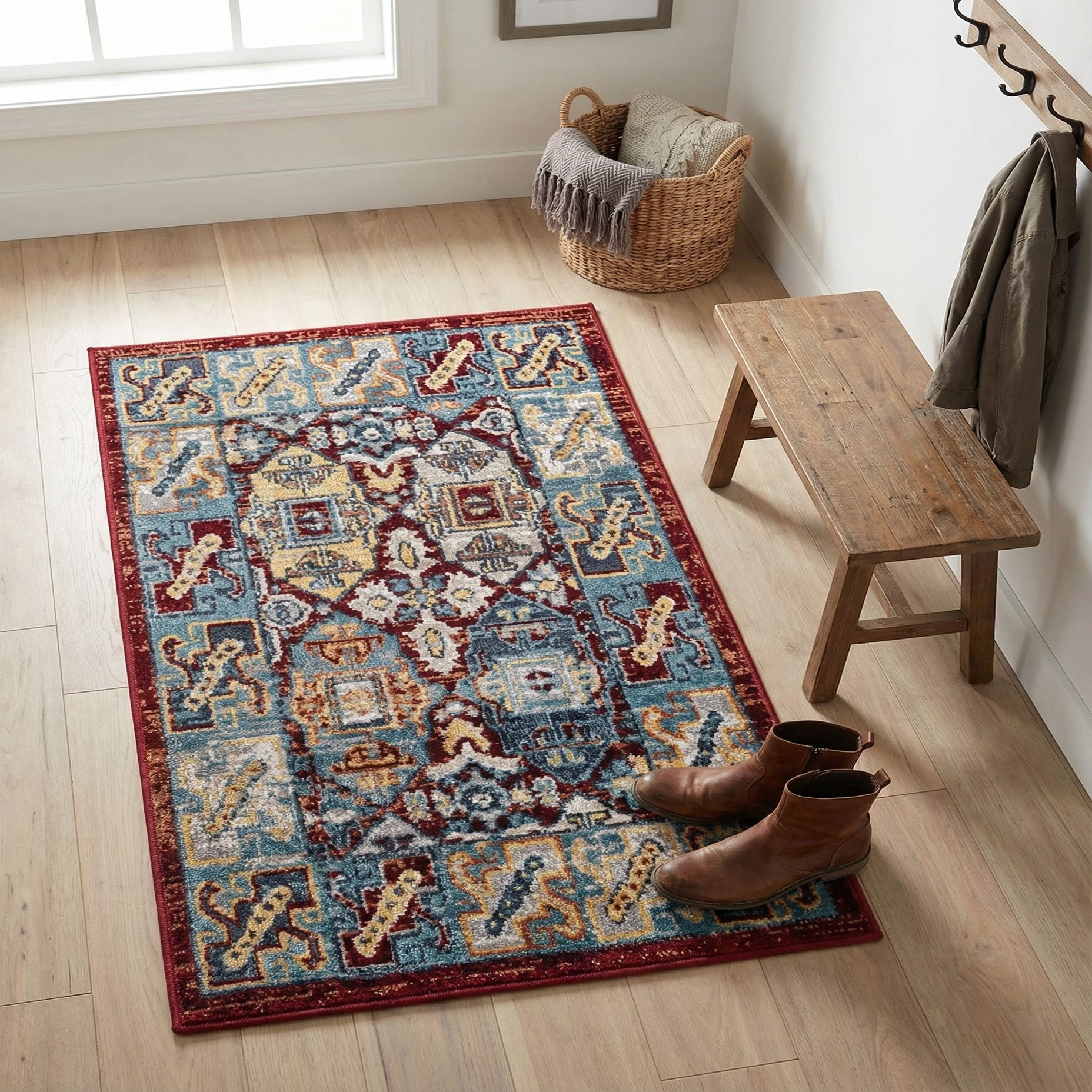 Primary color is Multi. Colors in this rug include: Multi, Beige, Black, Blue, Ivory, Gray, Red, Yellow.