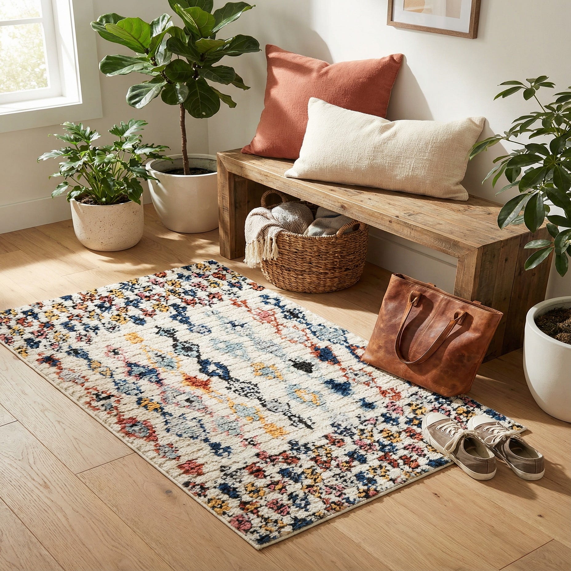 Primary color is Multi. Colors in this rug include: Multi, Black, Gray, Rust Red, Yellow, Pink, Light Blue.