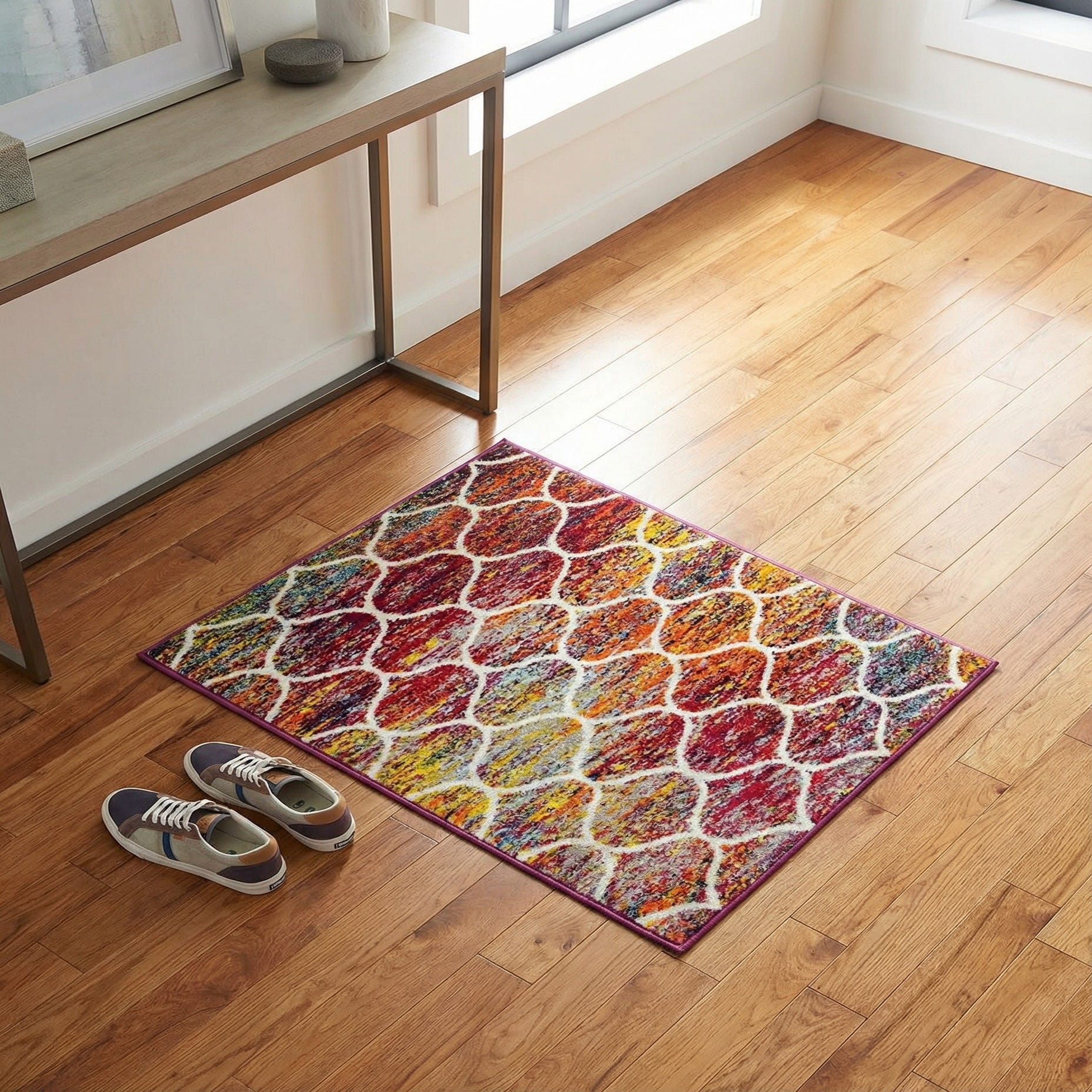 Primary color is Multi. Colors in this rug include: Multi, Black, Blue, Brown, Green, Orange, Purple, Red, Pink.