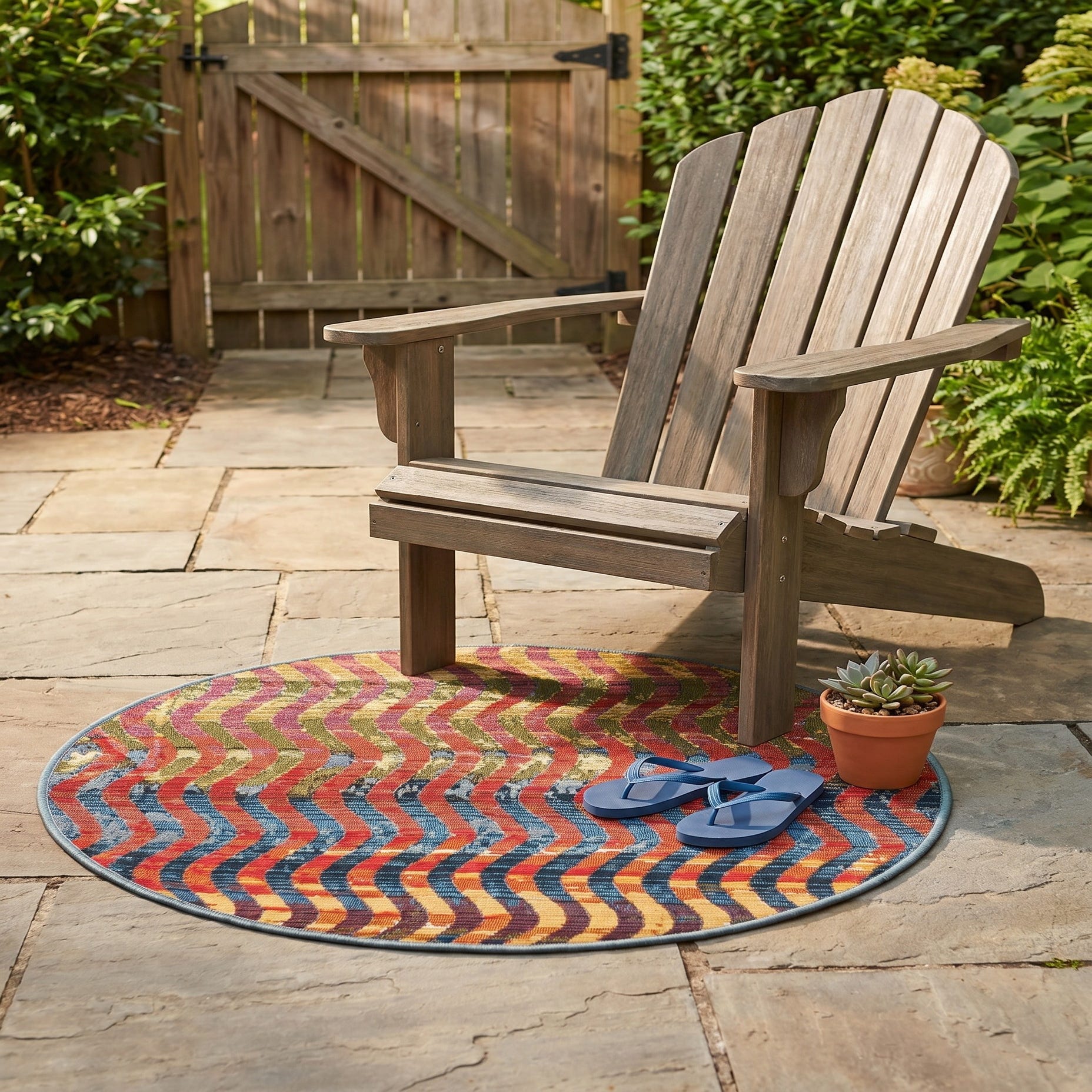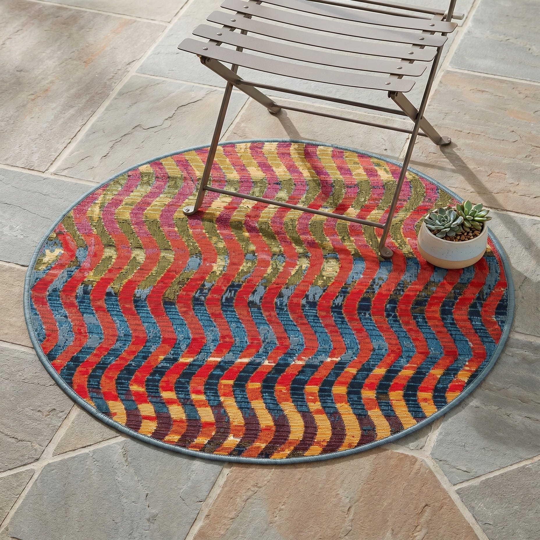 Fell in love with this rug when I saw it on-line for its delightful pattern and vivid colors. It arrived in two days from the day ordered about a week ago. We put it down on our renovated deck today...it is even more awesome than we thought it would be! The colors and pattern outset the colors of the deck perfectly.