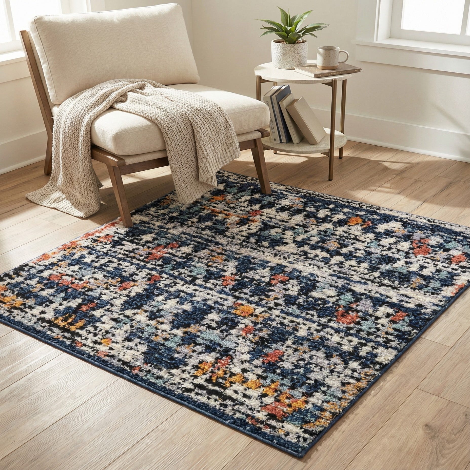 Primary color is Multi. Colors in this rug include: Multi, Black, Ivory, Navy Blue, Rust Red.