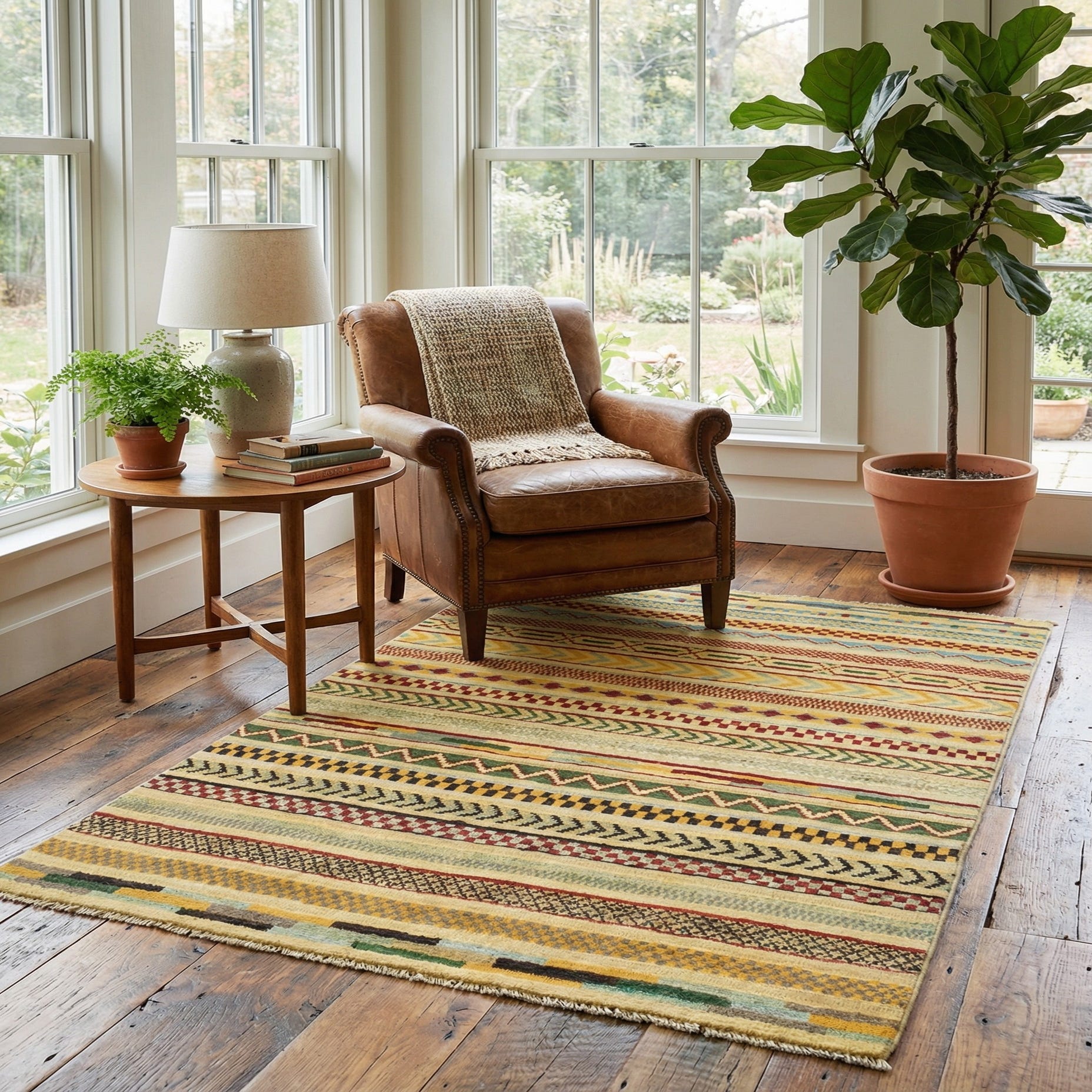 Primary color is Multi. Colors in this rug include: Multi, Beige, Blue, Brown, Burgundy, Cream, Gold, Hunter Green, Tan.
